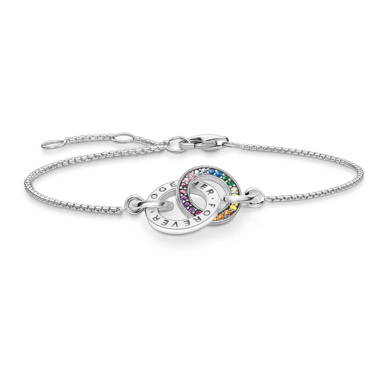 - Chain bracelet, rainbow colours, intertwined rings, “Together Forever” engraved detail, hand-set rainbow stones, lightly oxidised 925 sterling silver, adjustable length, lobster clasp fastening