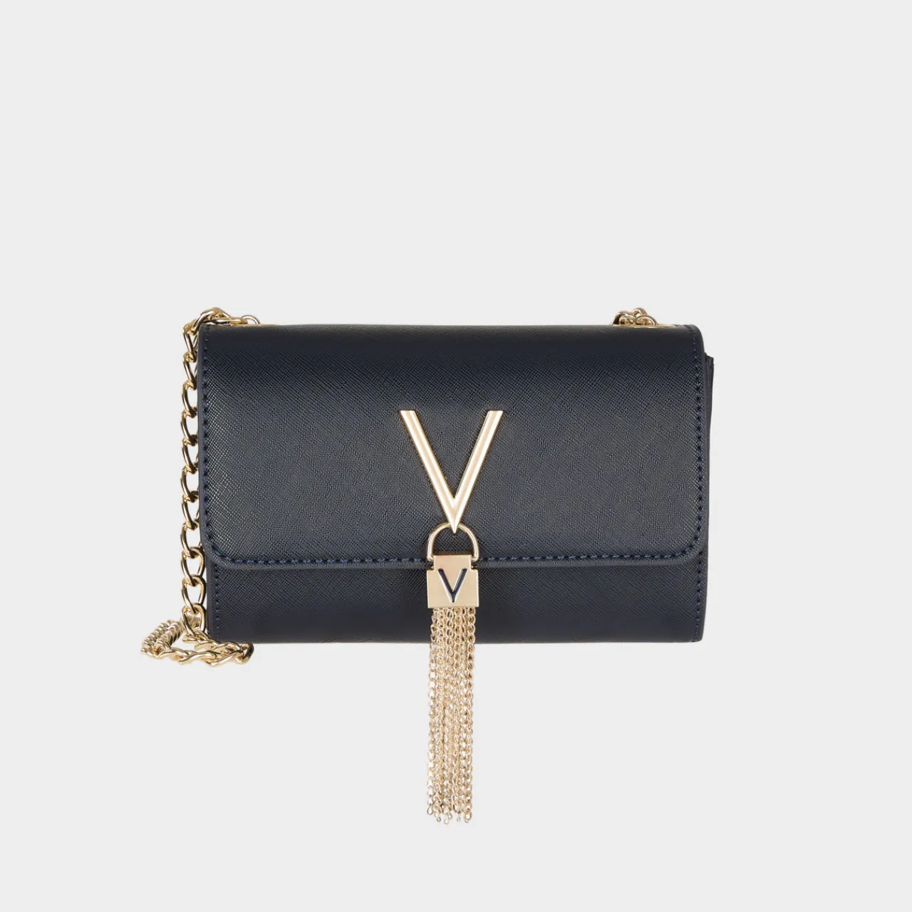 - Flap closure with plug fastening, detachable chain shoulder strap, V logo hardware with tassel detail, tonal stitching, smooth finish