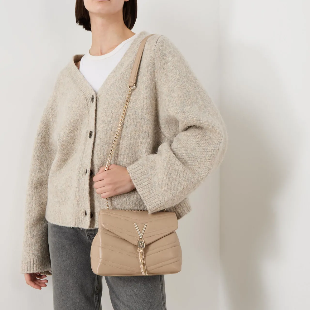 - Chain straps, flap closure, V-logo detail with gold-tone metal tassel, chevron stitching details