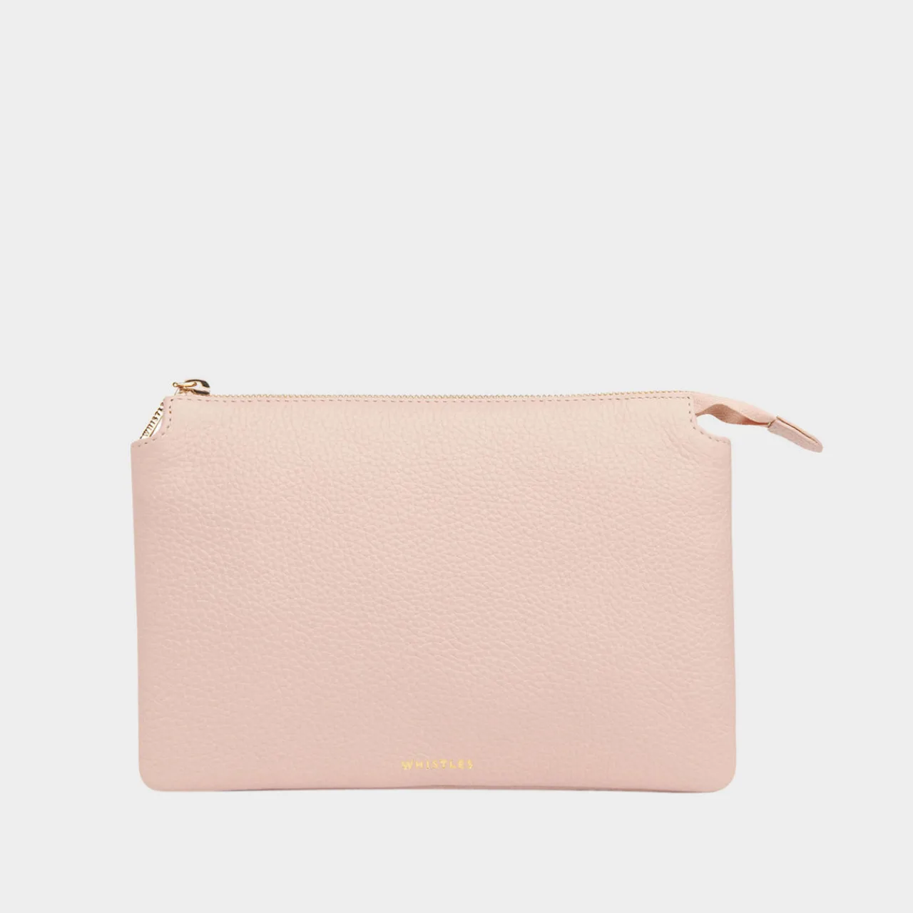 - Double pouch, gold-tone hardware, zip top fastening, branding.