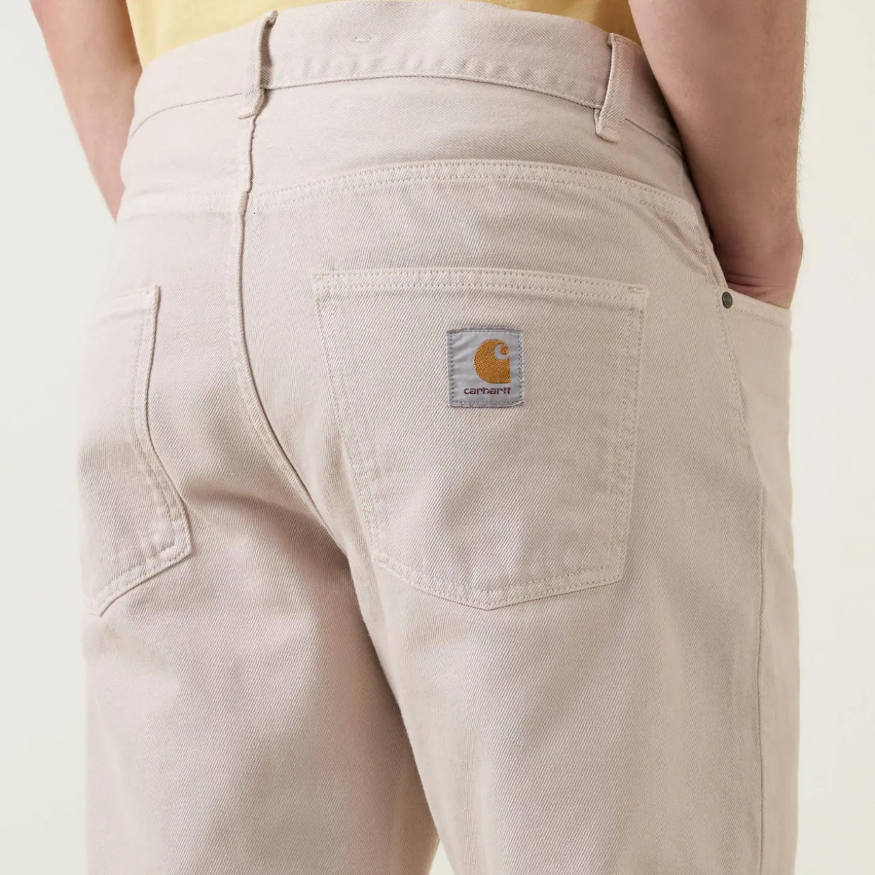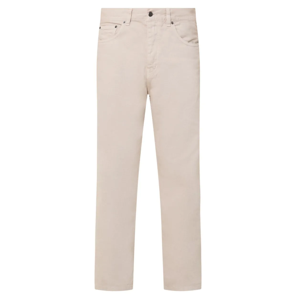 - Mid-rise, straight leg, tapered silhouette, belt loops, concealed fly and button fastening, five-pocket styling, back yoke, clean hems, tonal stitching, square logo label, midweight fabric