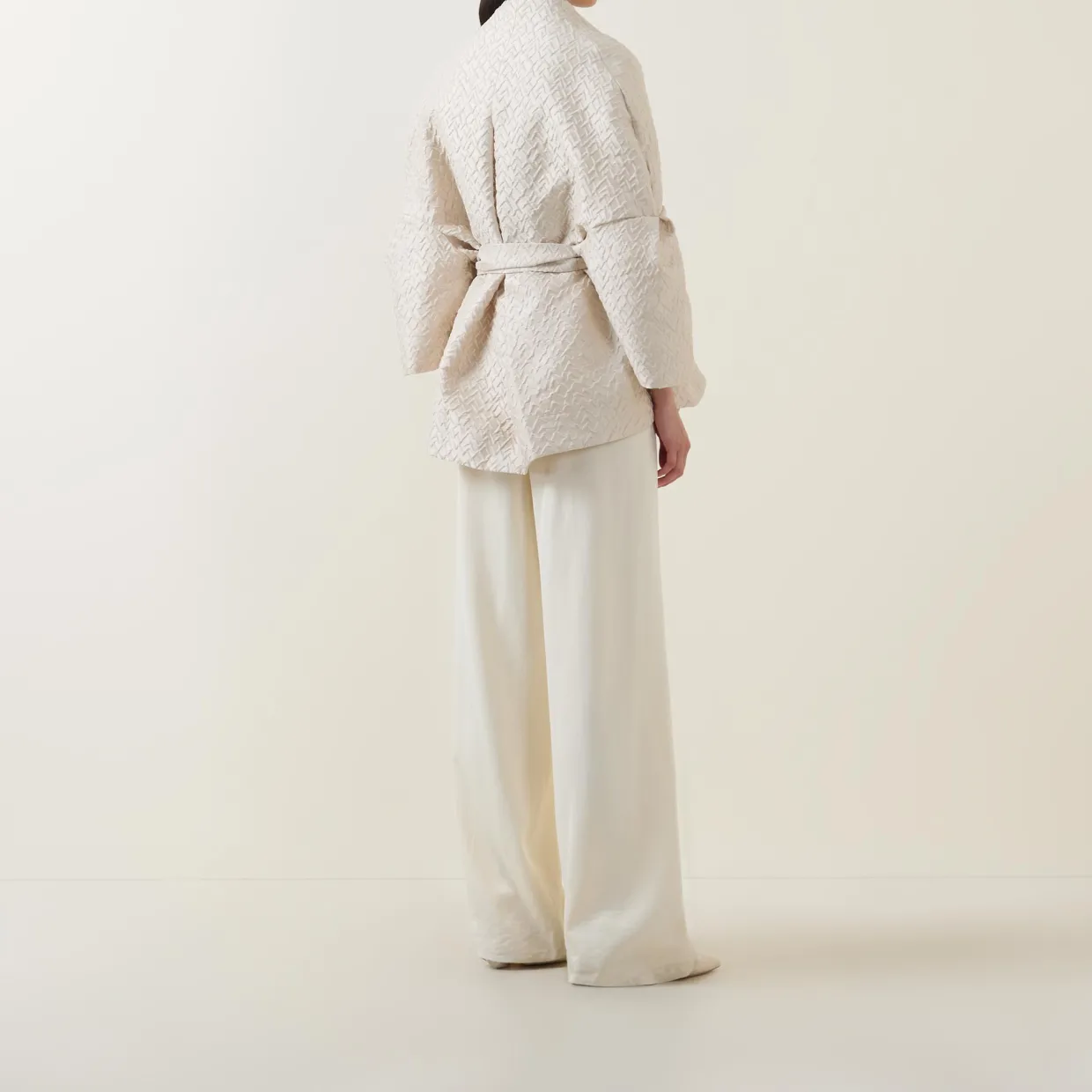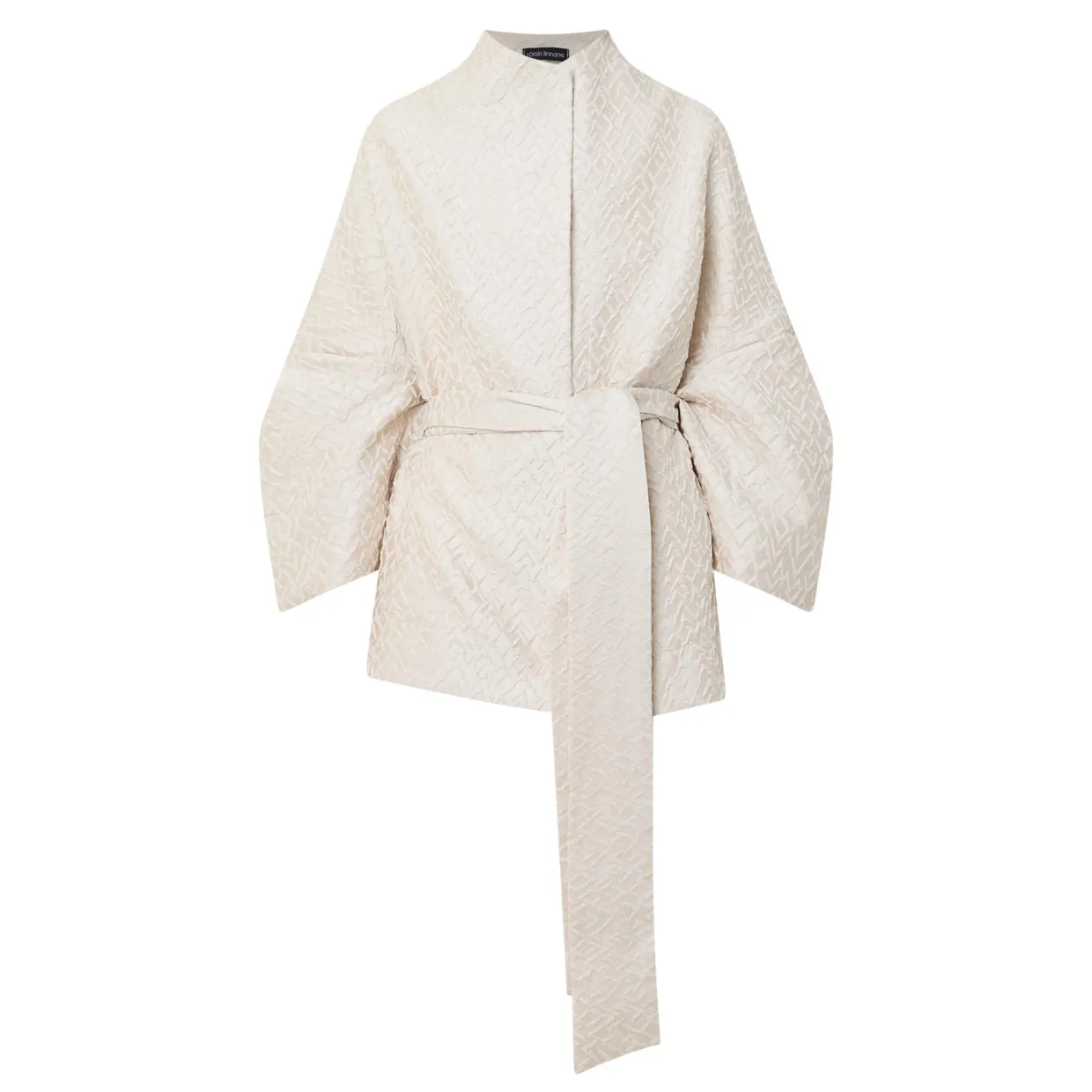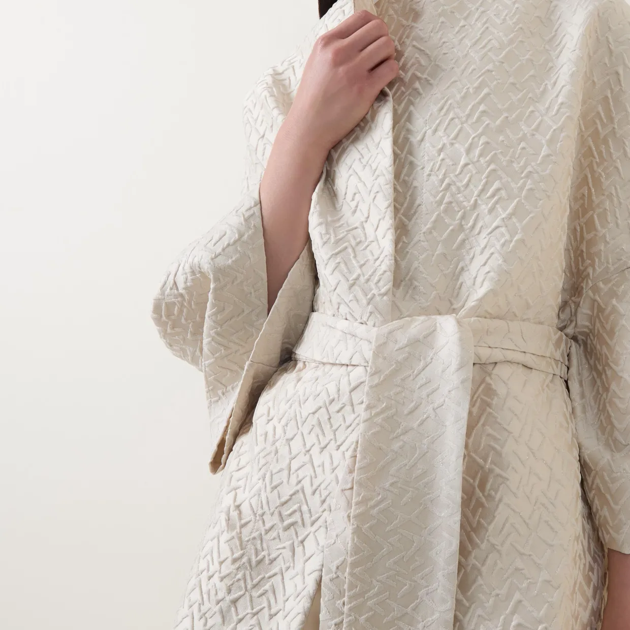 - High neckline, rounded shoulders, long cocoon sleeves, pleated detailing, concealed front fastening, matching belt closure, curved hem, textured finish