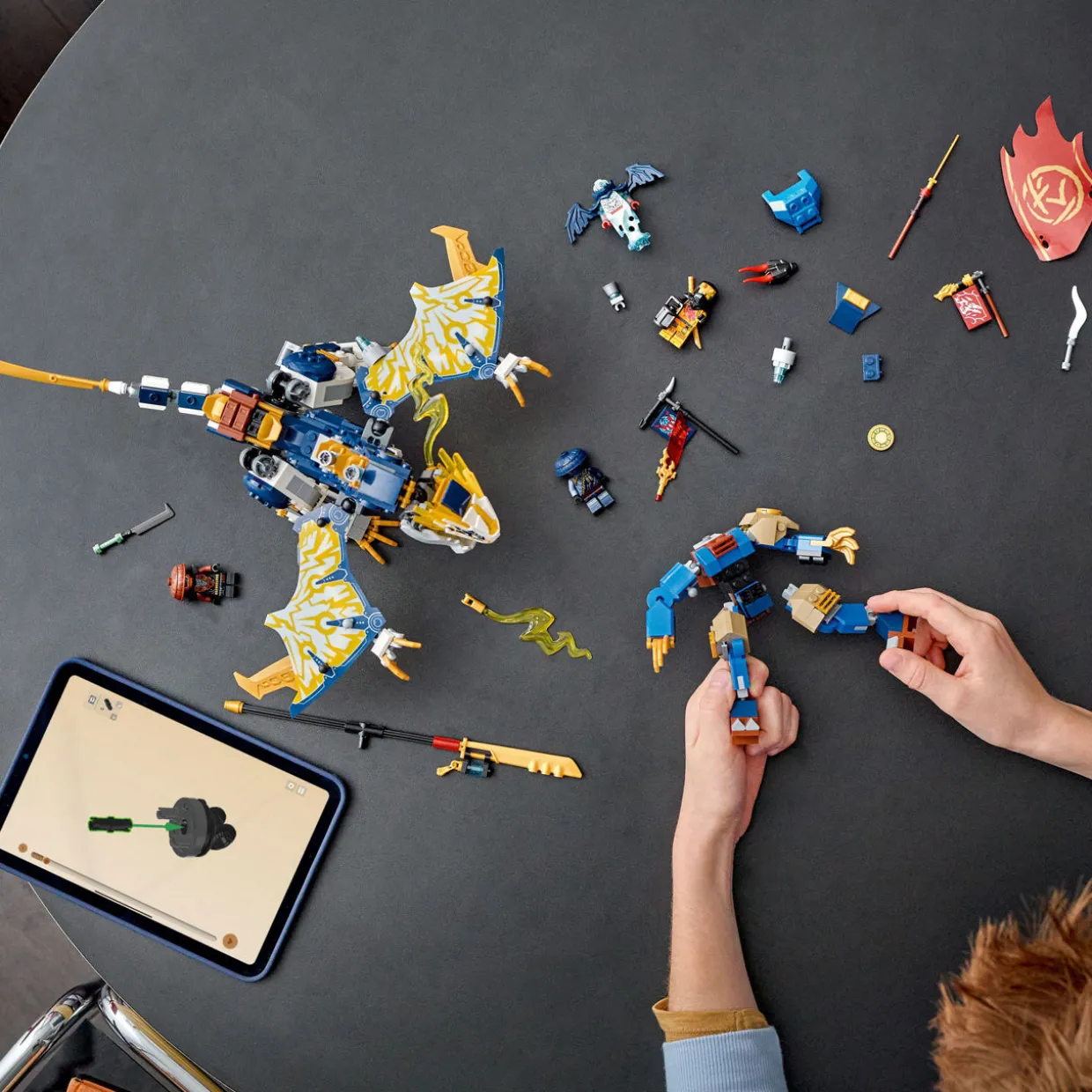 - 584 pieces, Ninijago® battle playset, dragon toy, mech toy, four minifigures