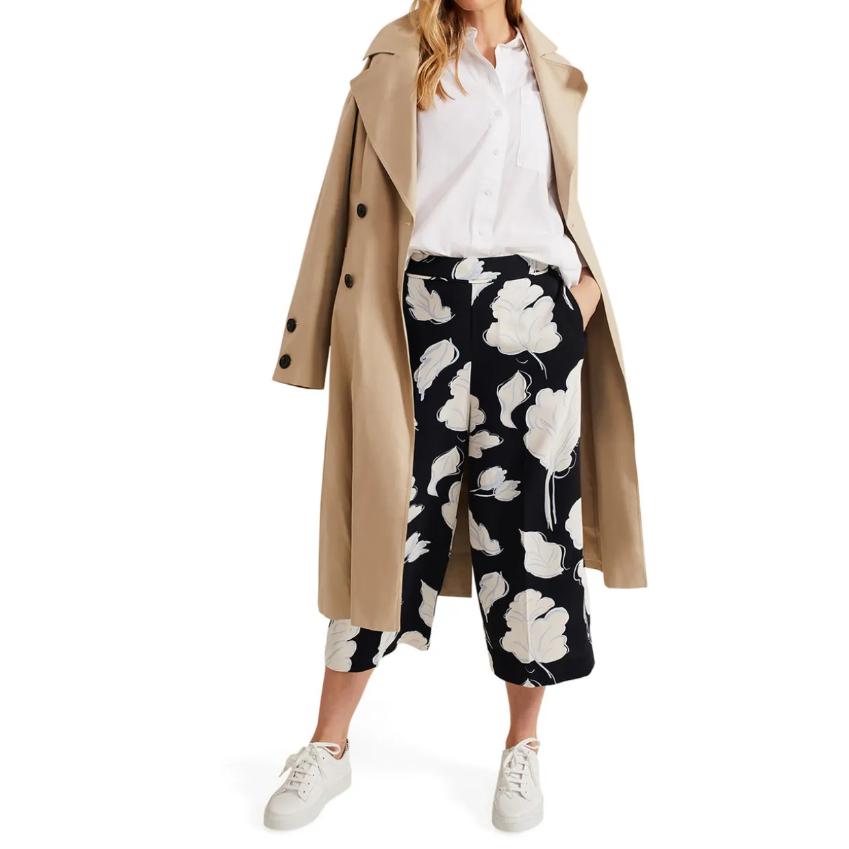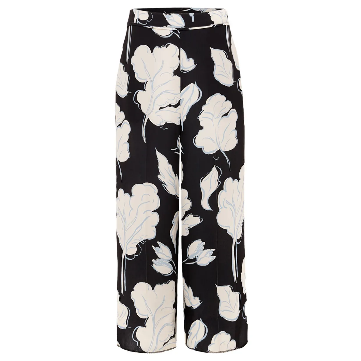 - Floral print, wide leg, cropped length, pockets, zip fastening