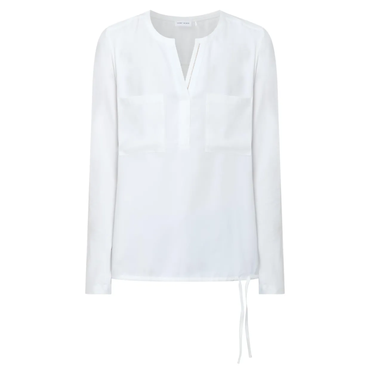- Notched neckline, long sleeves, chest patch pockets, drawstring adjustable hemline