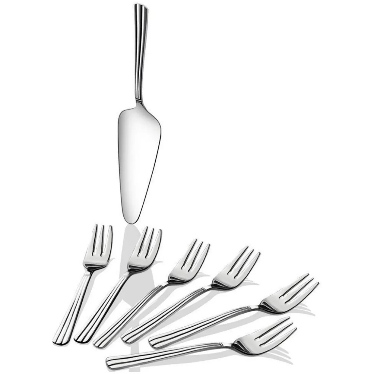 - Six pastry forks, one cake server, high polished finish, contemporise design, seven-piece pastry set