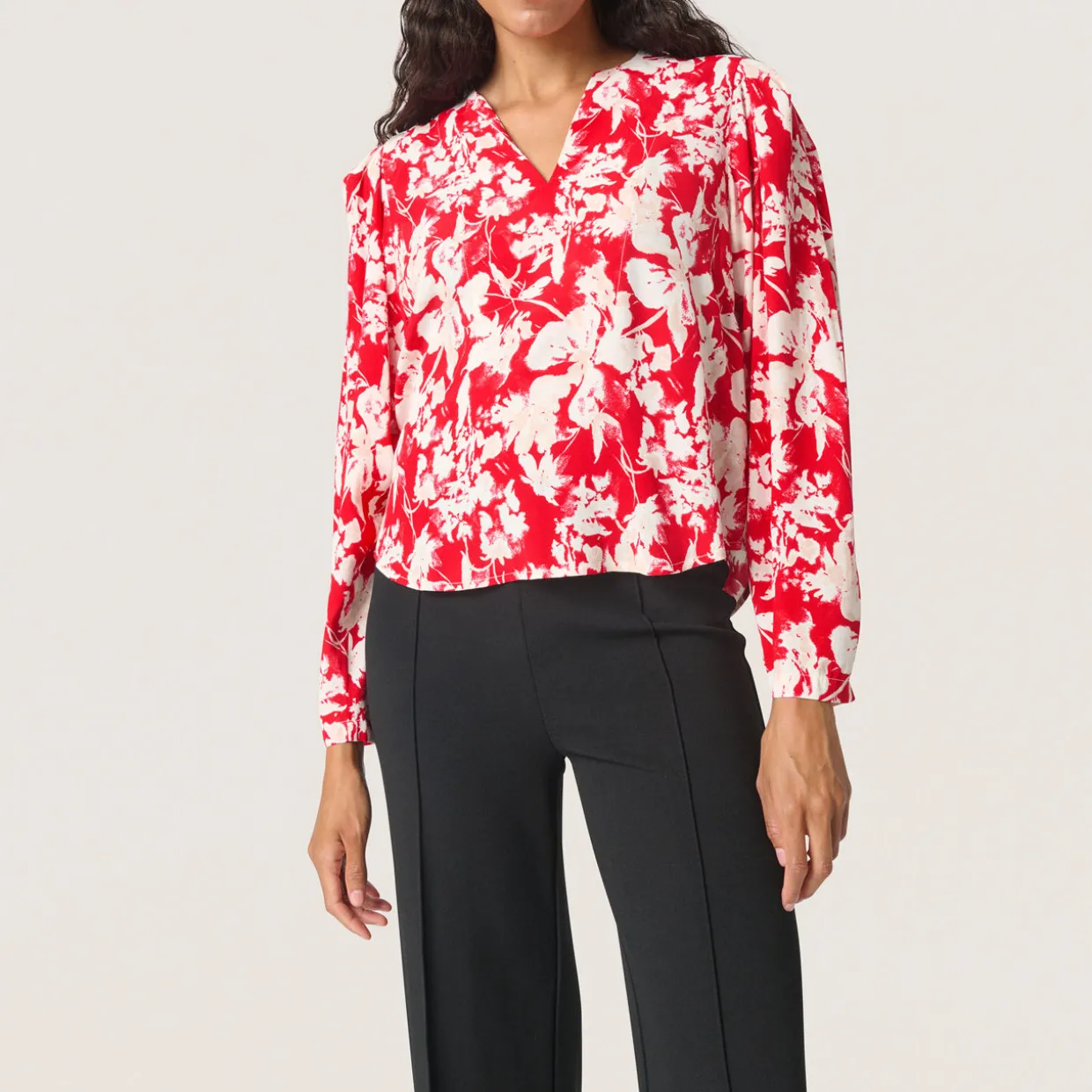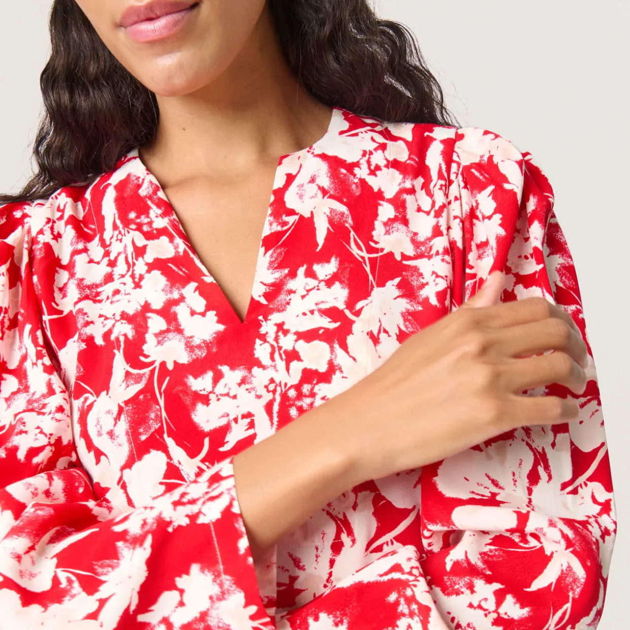 - Notched neckline, long blouson-style sleeves, curved hemline, printed