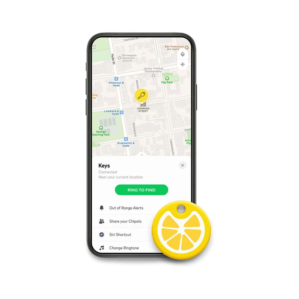 - Lemon design, splashproof, 120dB alert sound volume, multiple tones to choose from, 200ft range, ring your item with the Chipolo app or double press the Chipolo to ring your phone, track your item to where you had it last via the app, be alerted if you leave without your item, share your Chipolo with your loved ones to help each other find your misplaced items, mark your item as lost in the app and hen any Chipolo user comes near your item, you will be notified with an updated location