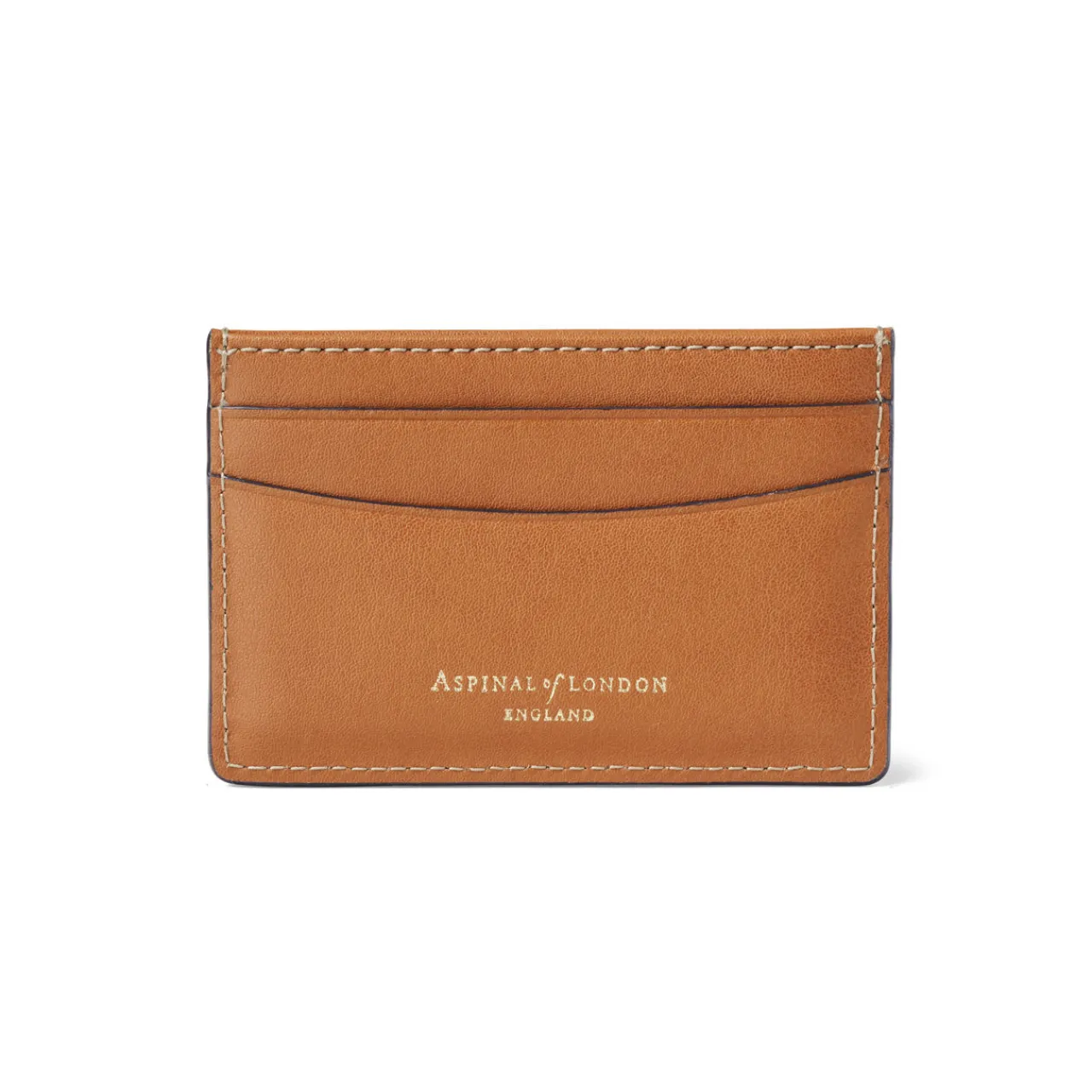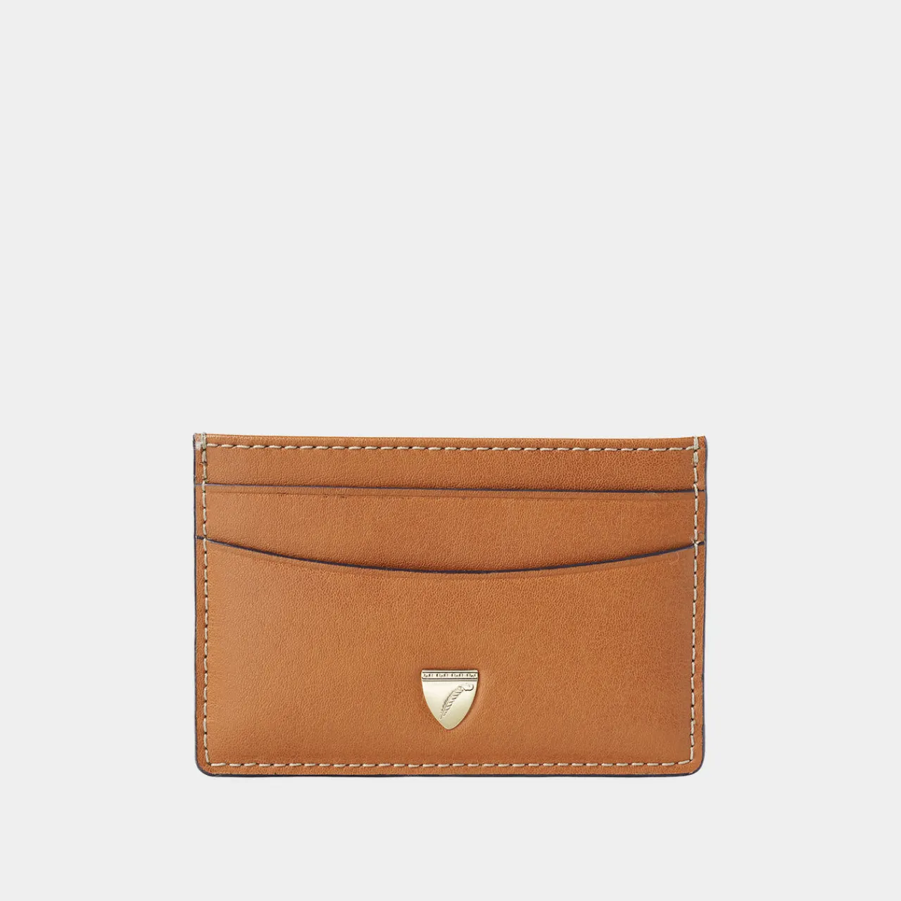 - Four external card slots, one central slip pocket, logo lettering, shield logo badge, smooth texture, rounded edges, lined