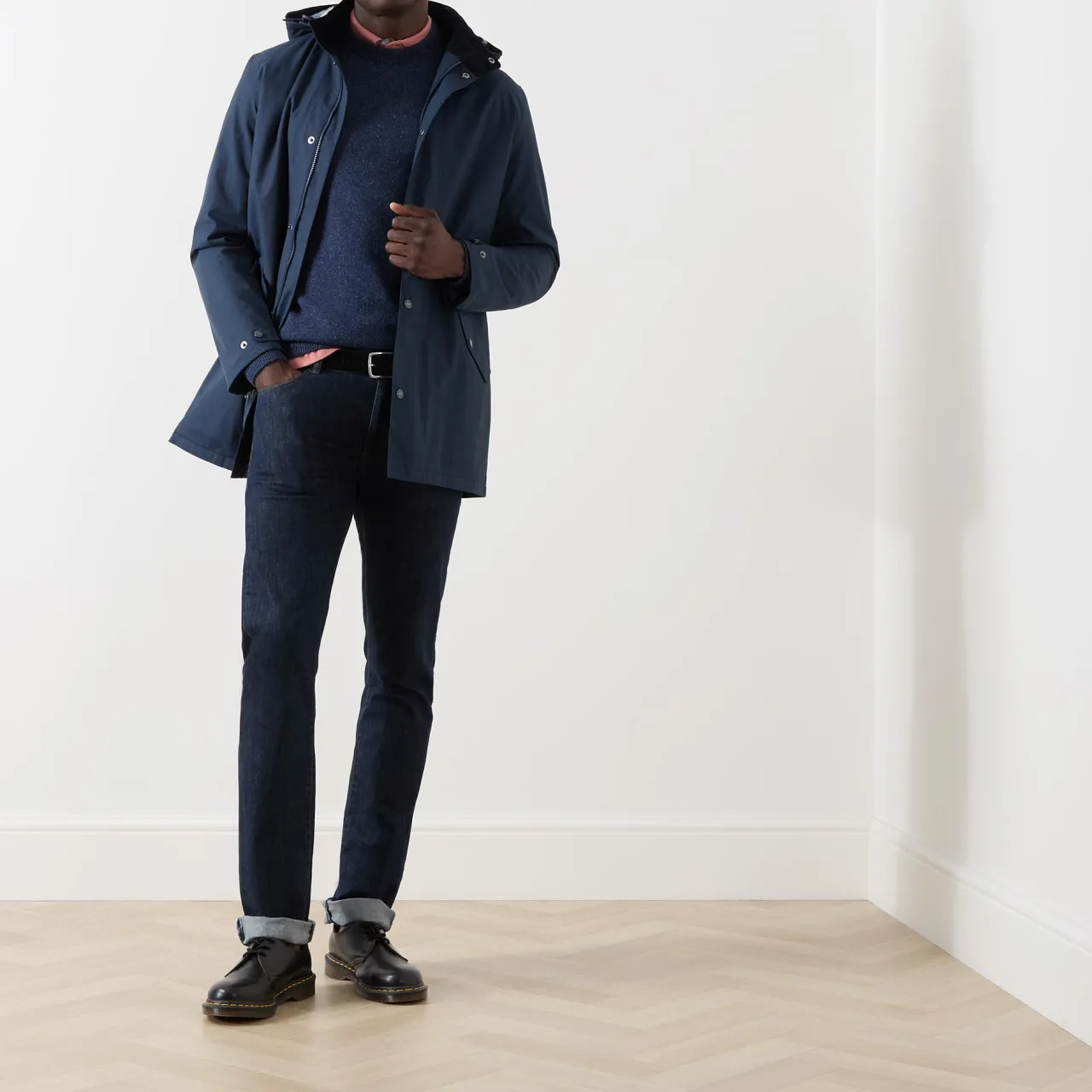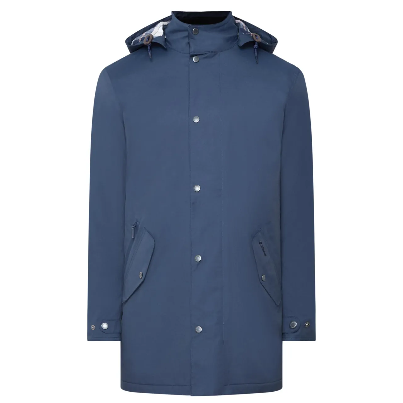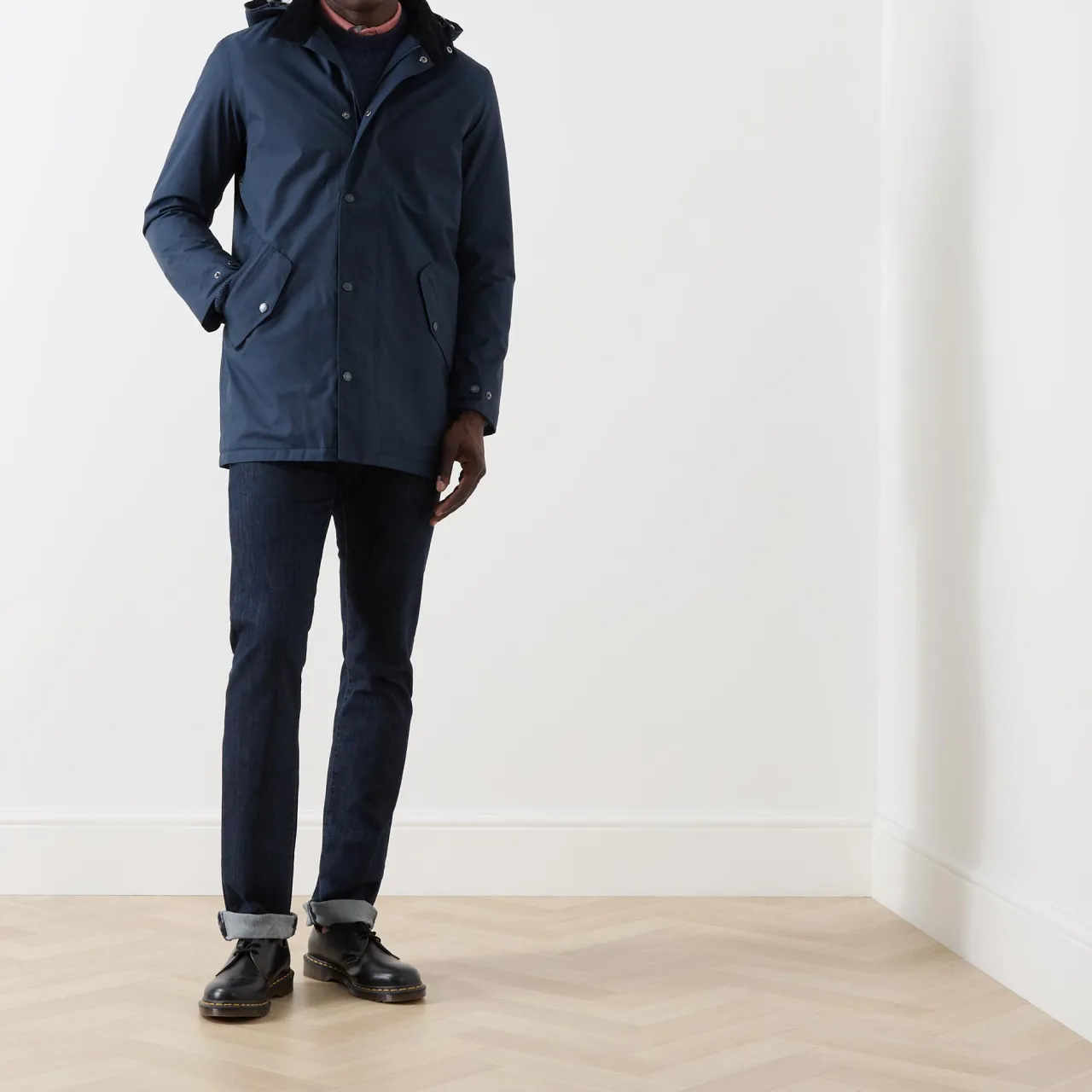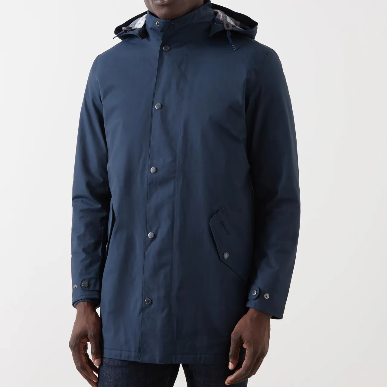 - Detachable hood with adjustable drawstring fastening, tartan lined, stand collar with corduroy lining, long sleeves, adjustable snap button cuffs, front branded zip fastening, additional snap button placket, two angled flap pockets, one zip pocket, straight hem, rear vents with snap button fastenings,