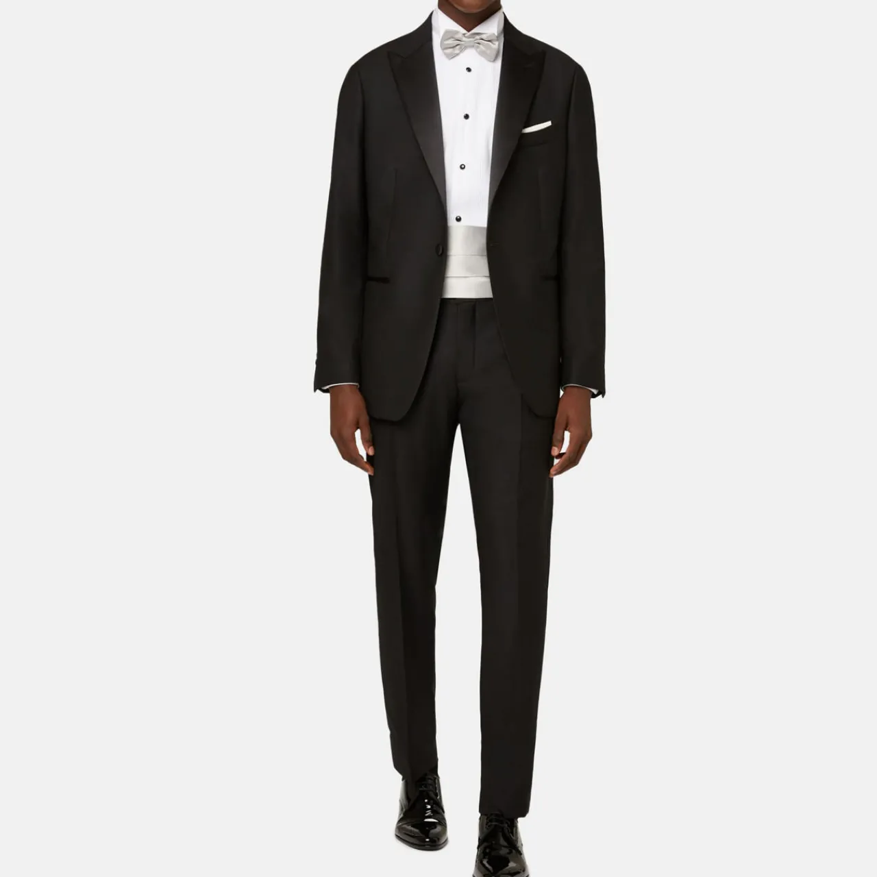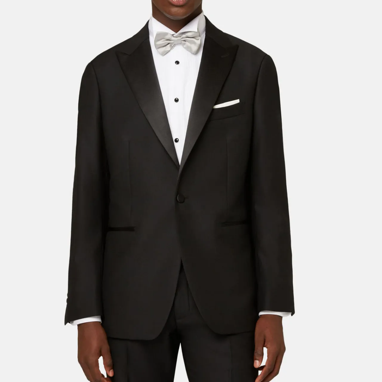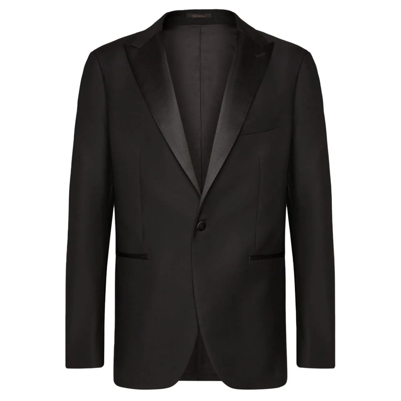 - Satin collar, peaked lapels, long sleeves, button fastenings, single-breasted