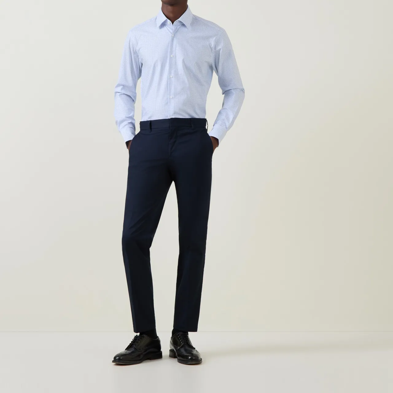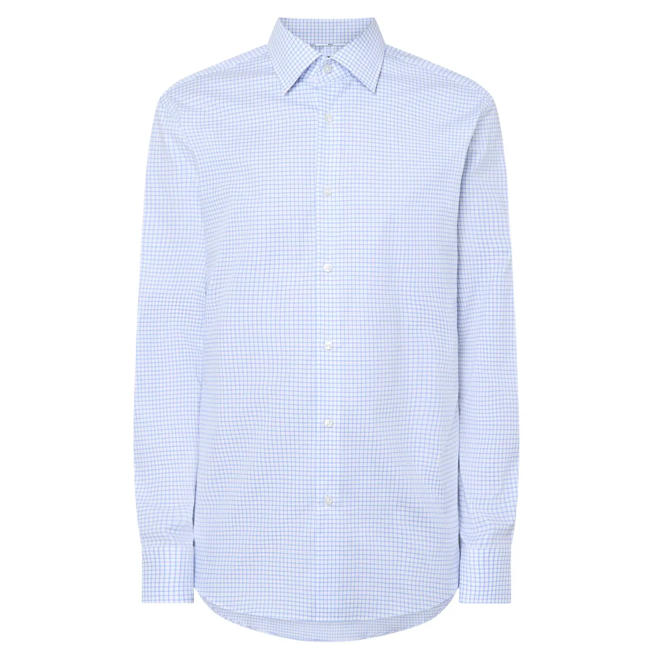 - Grid check pattern, spread collar, button fastenings, single cuffs