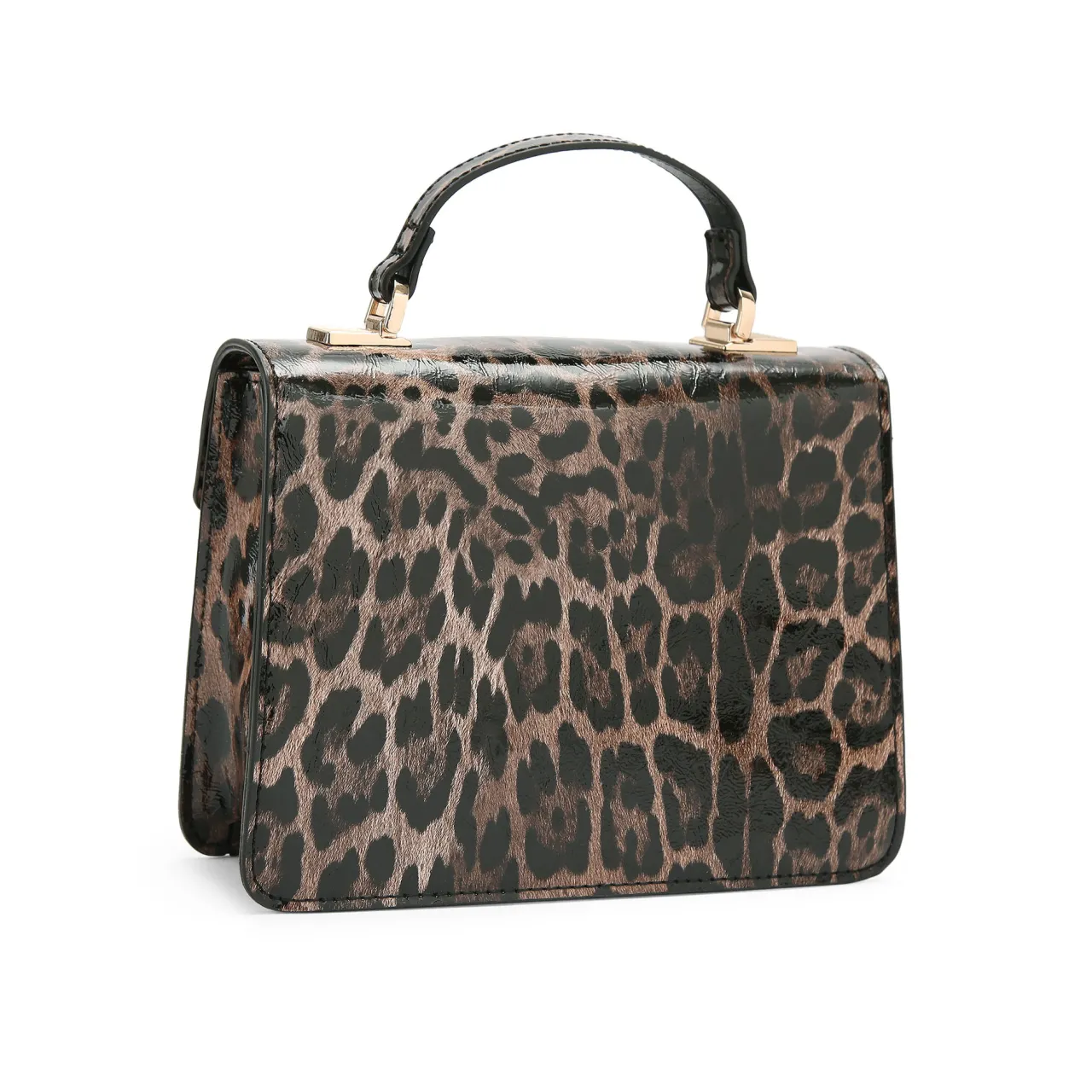 - Top handle silhouette, leopard patent exterior, gold branded plate, flap closure