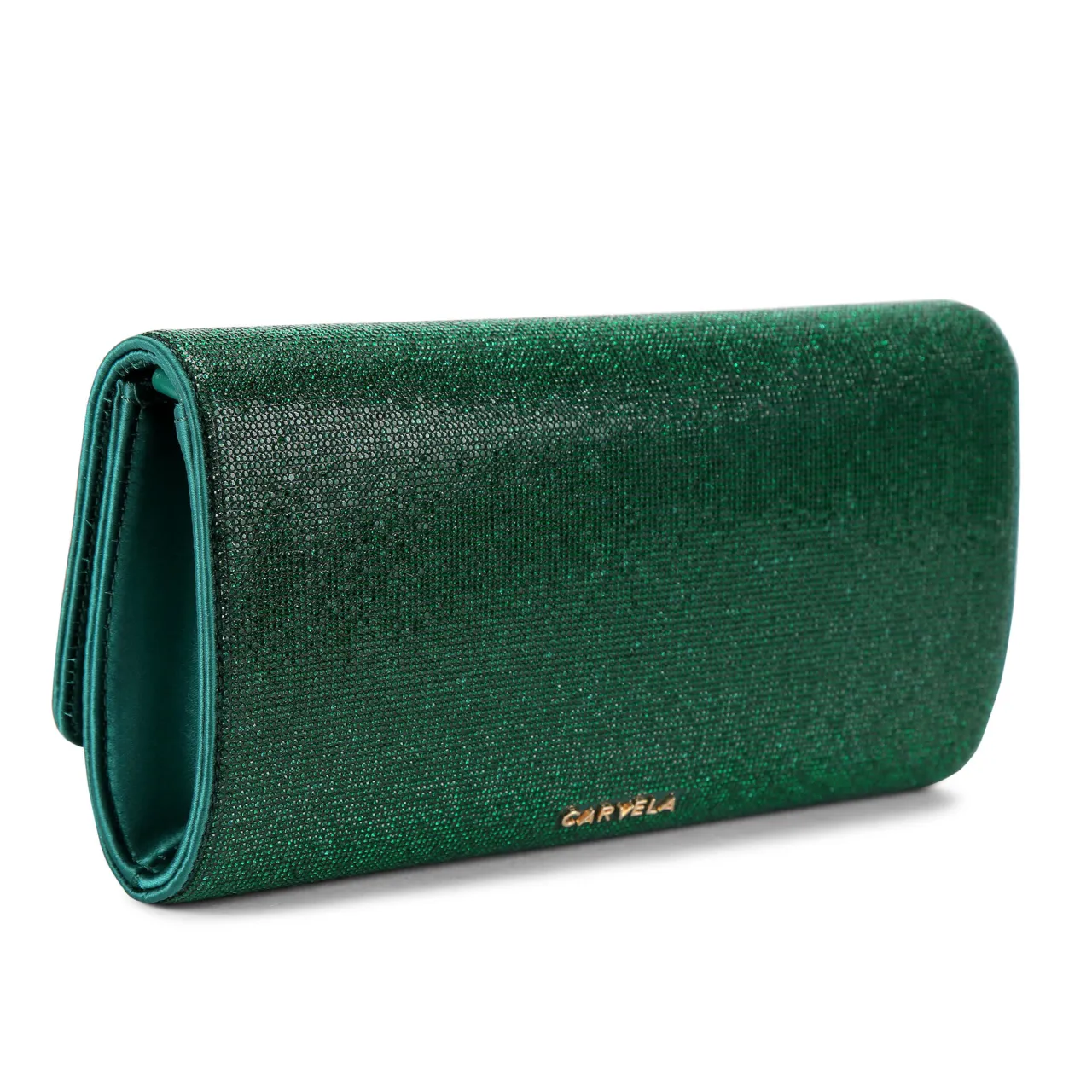 - Clutch silhouette, fabric design, chain strap, crystal embellishment, gold branding