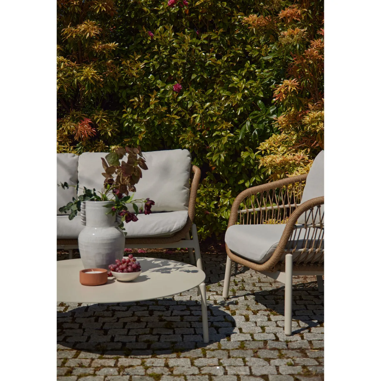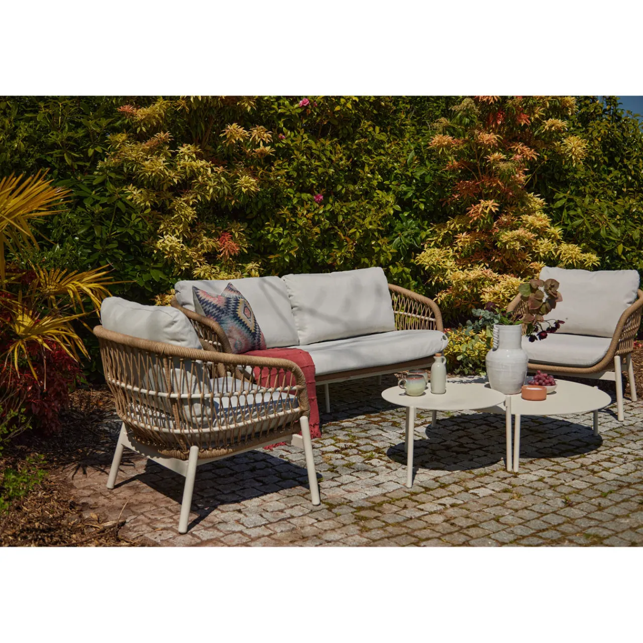 - Composition: Rattan, powder-coated aluminium, natural rope, polyurethane foam, acrylic fibres