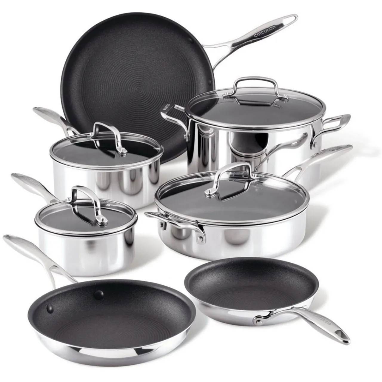 - Set Contains: 16cm saucepan with lid, 20cm saucepan with lid, 22cm frying pan, 25cm frying pan, 32cm frying pan, 26cm open sauté pan, 26cm stockpot
