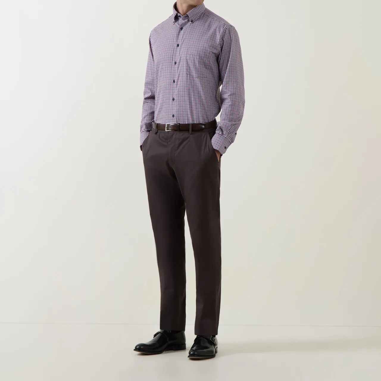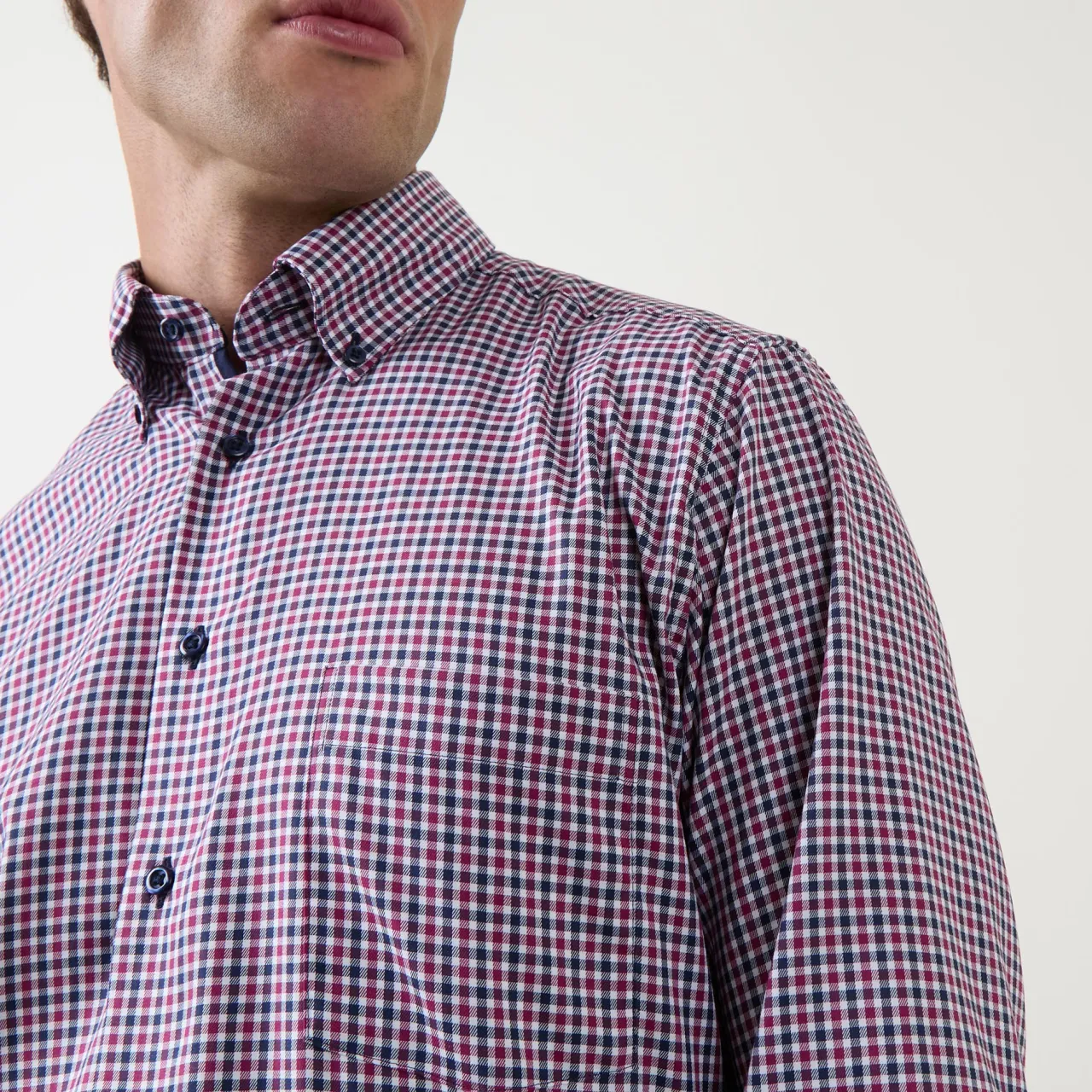 - Button-down collar, long sleeves, button fastenings, single cuffs, check pattern, curved hemline