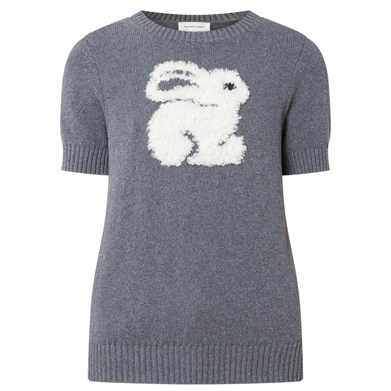 - Short sleeves, bunny motif, crew neck, ribbed trims, straight hemline