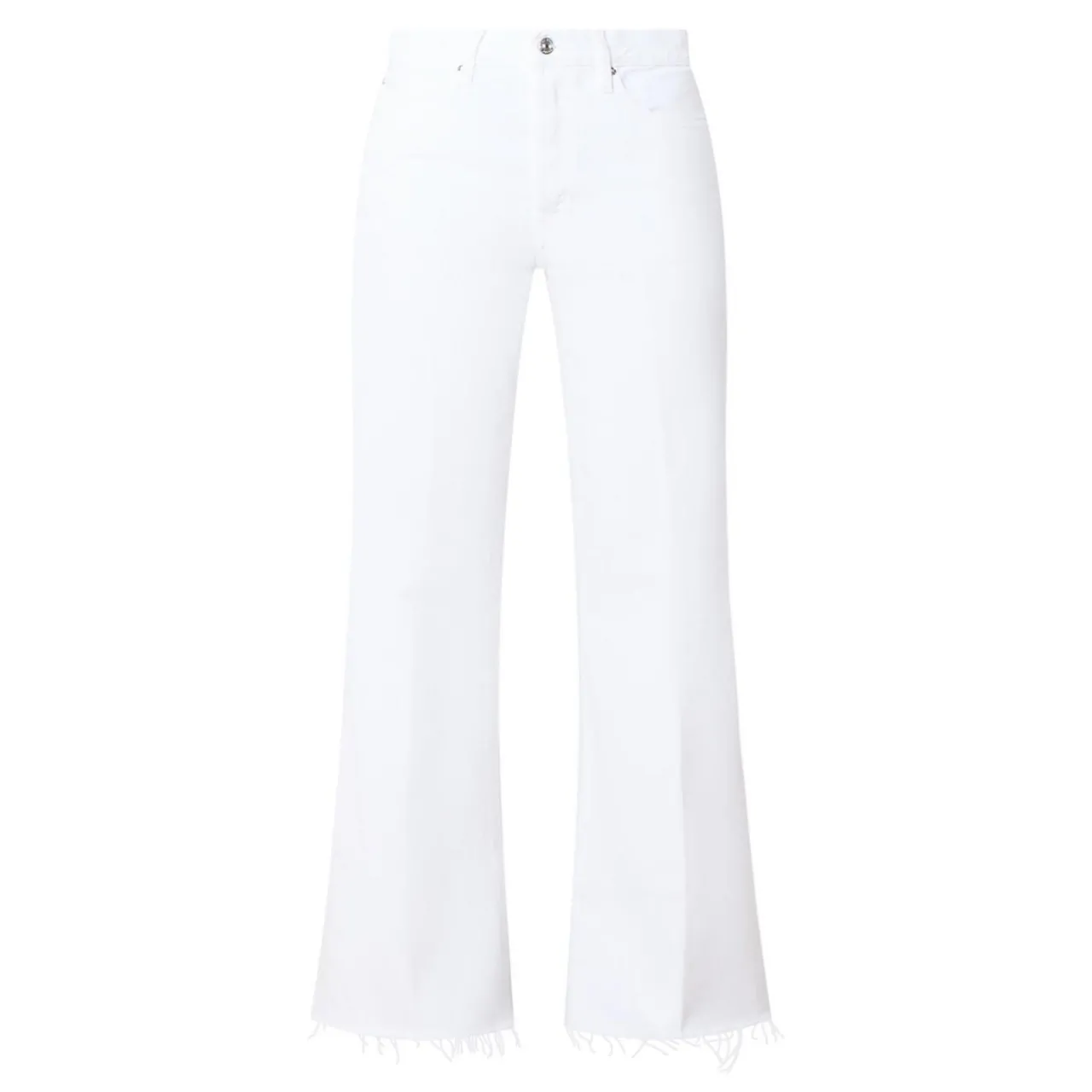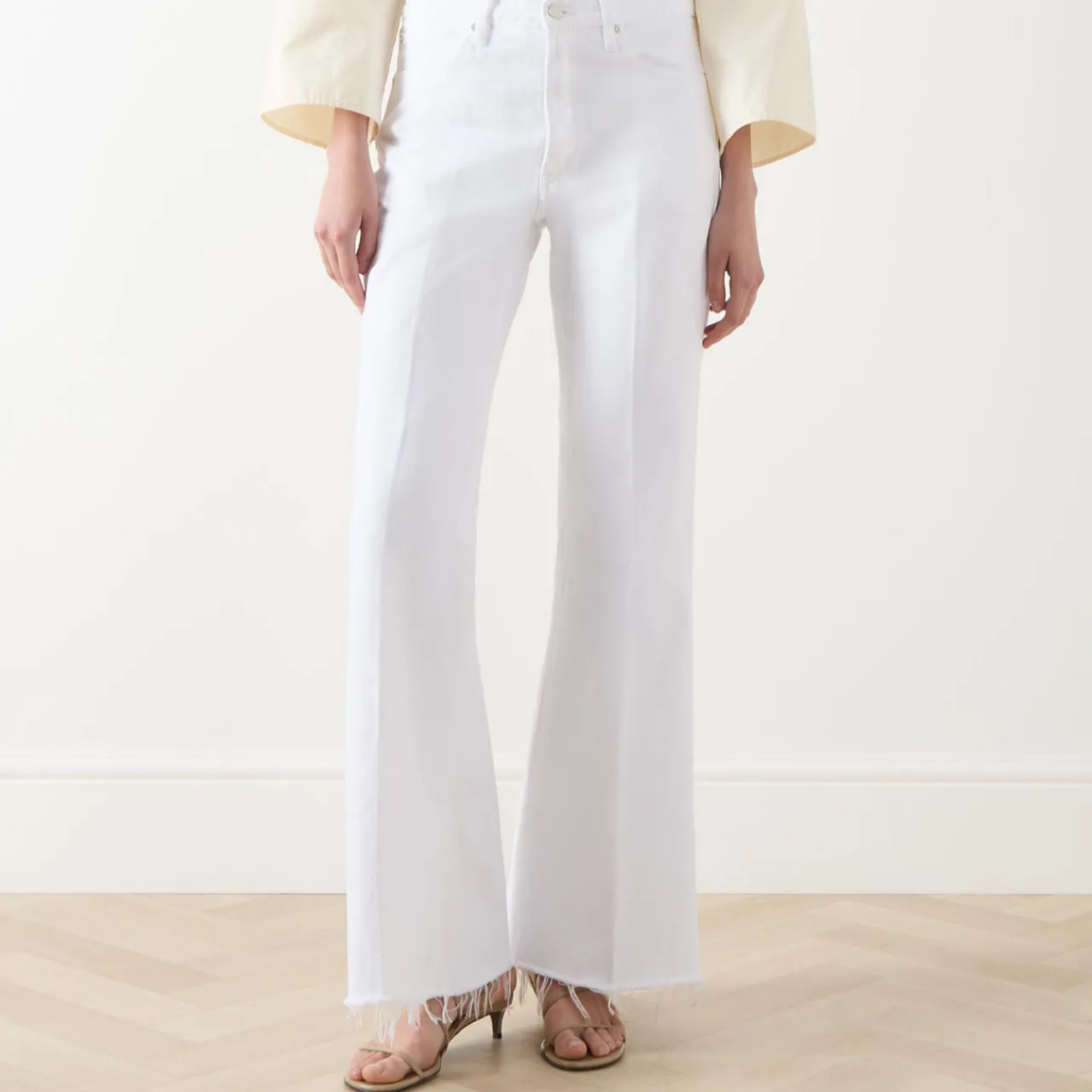- High-rise, flared leg, full length, belt loops, concealed fly and button fastening, five-pocket styling, raw-edge hems, tonal stitching, rigid denim, vintage-inspired design
