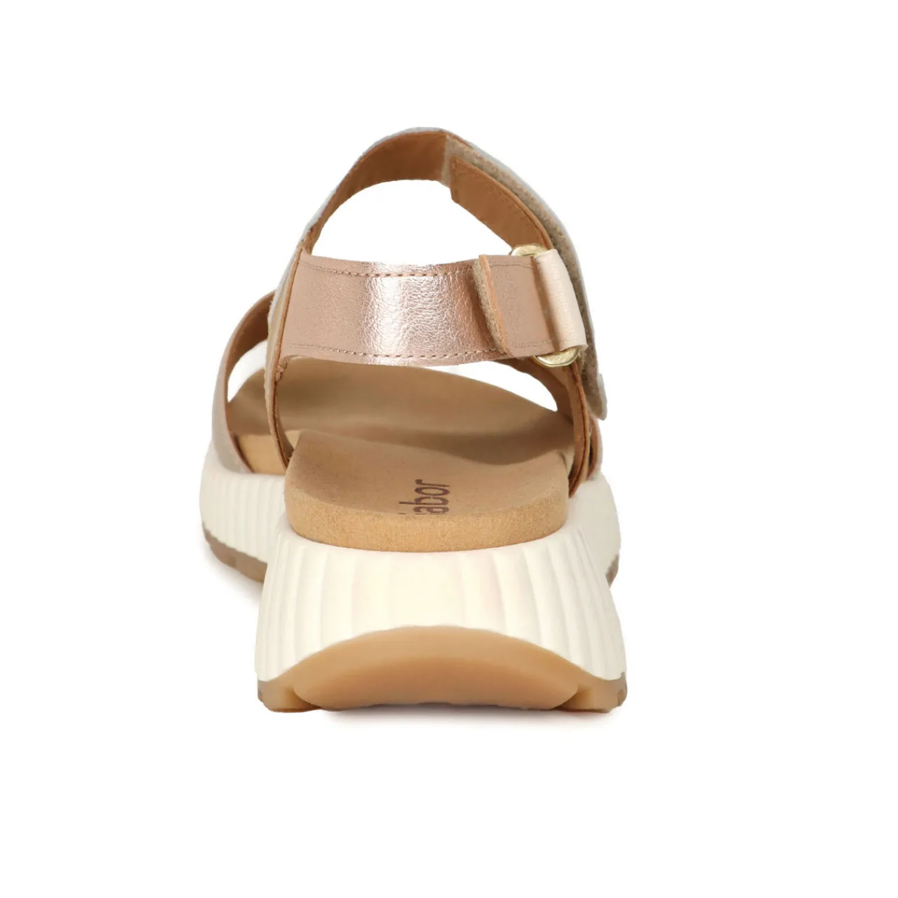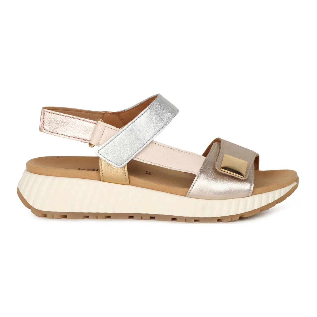 - Wedge heel silhouette, round toe, hook and loop fastening, colour block design, branded insole, metallic finish
