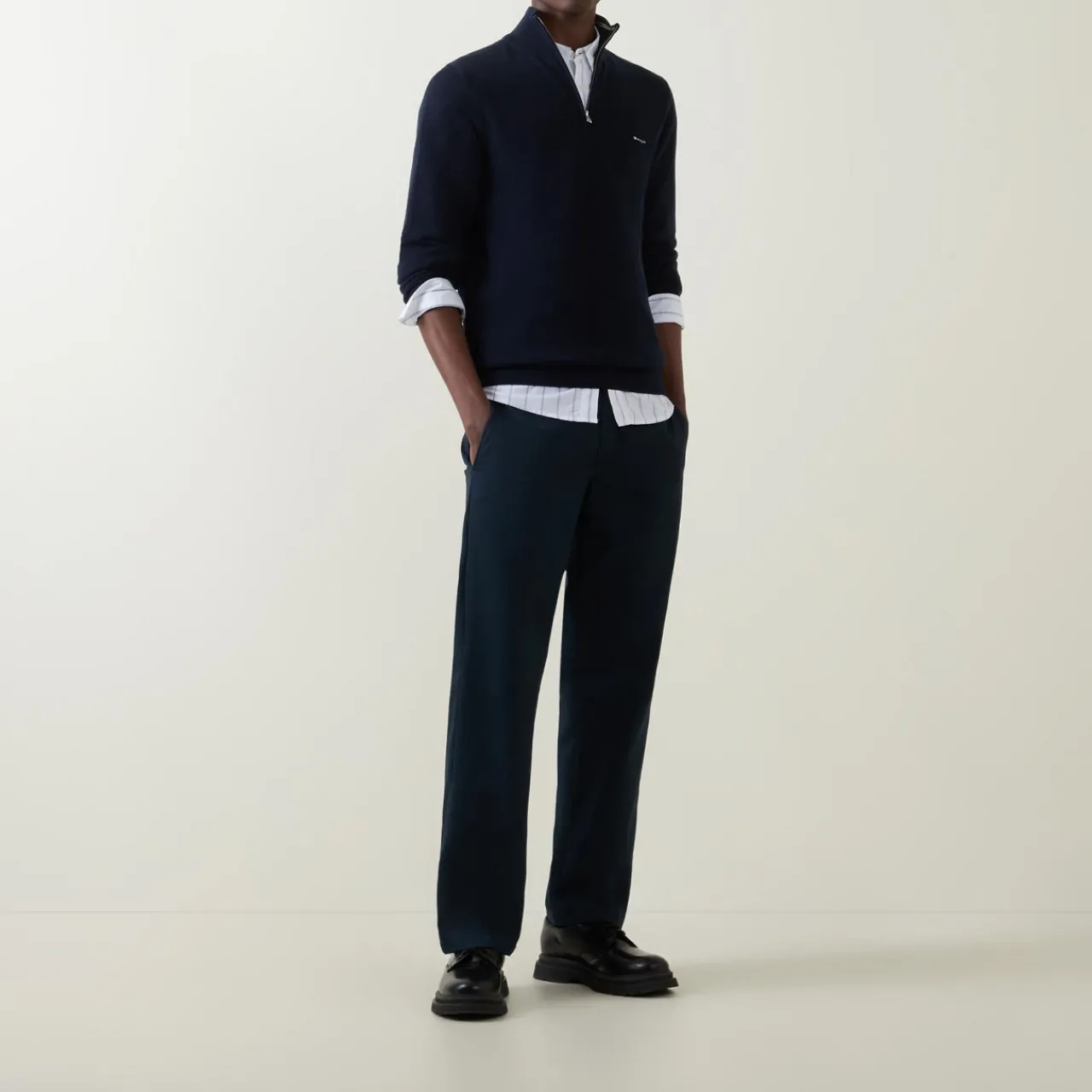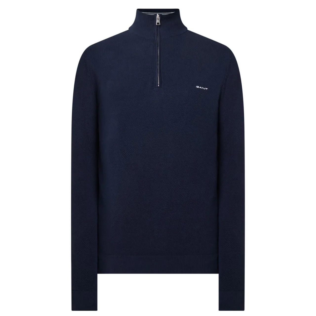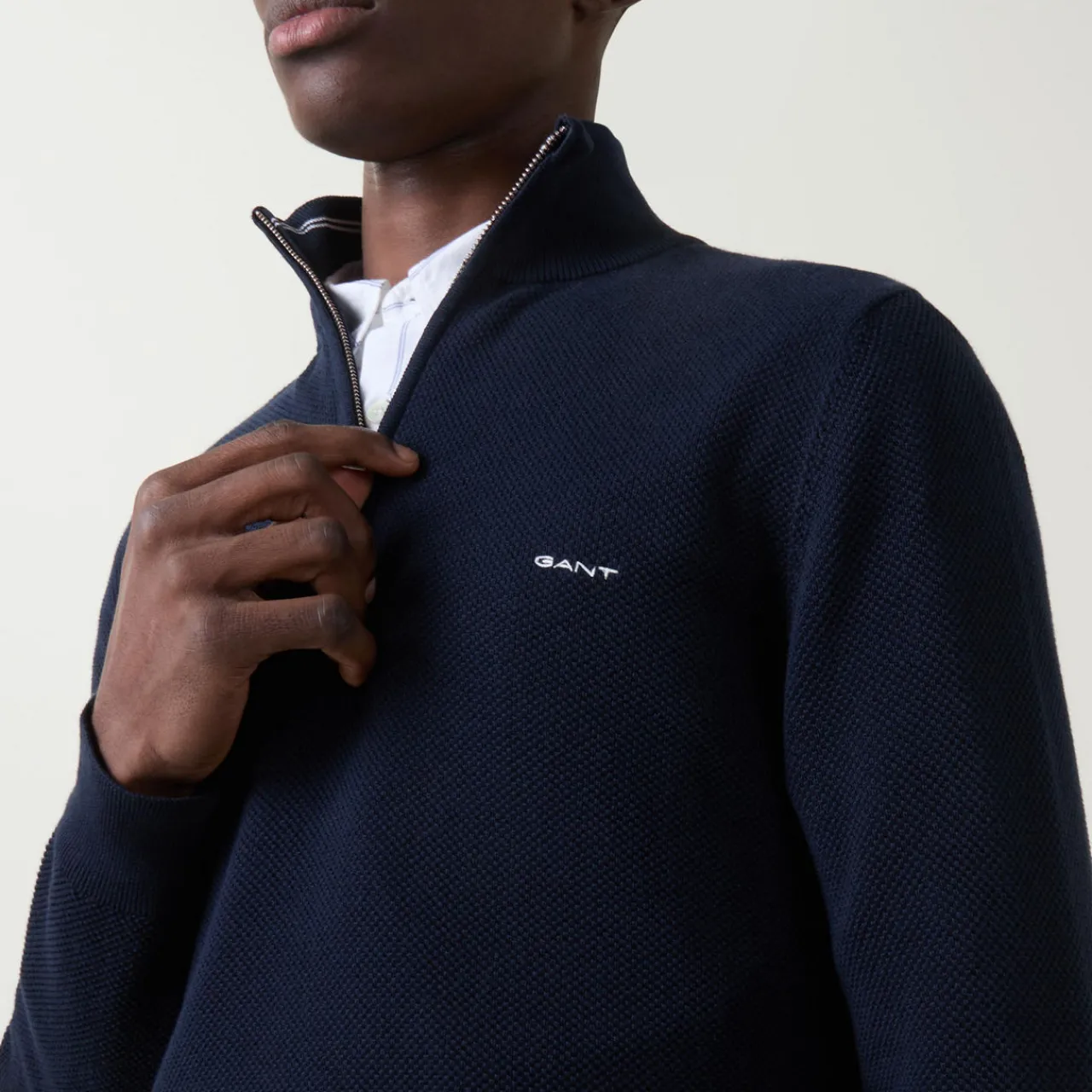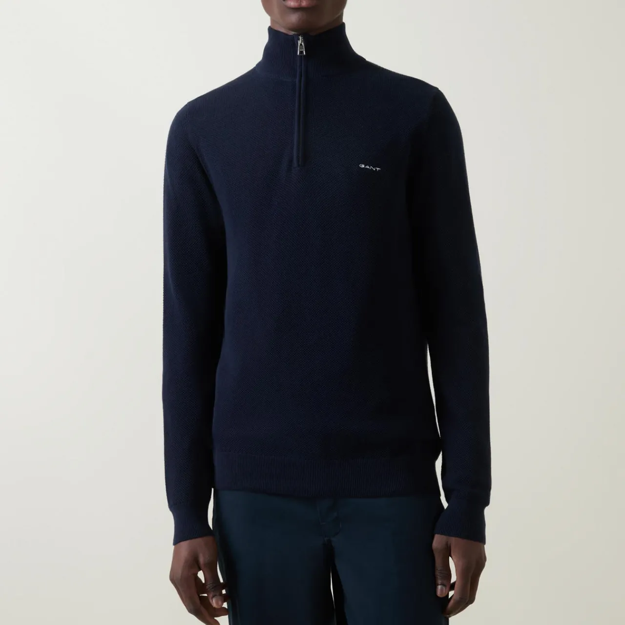 - Half-zip fastening, high neckline, ribbed trims, knit structure, embroidered logo detail