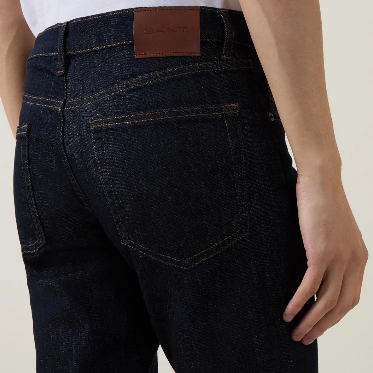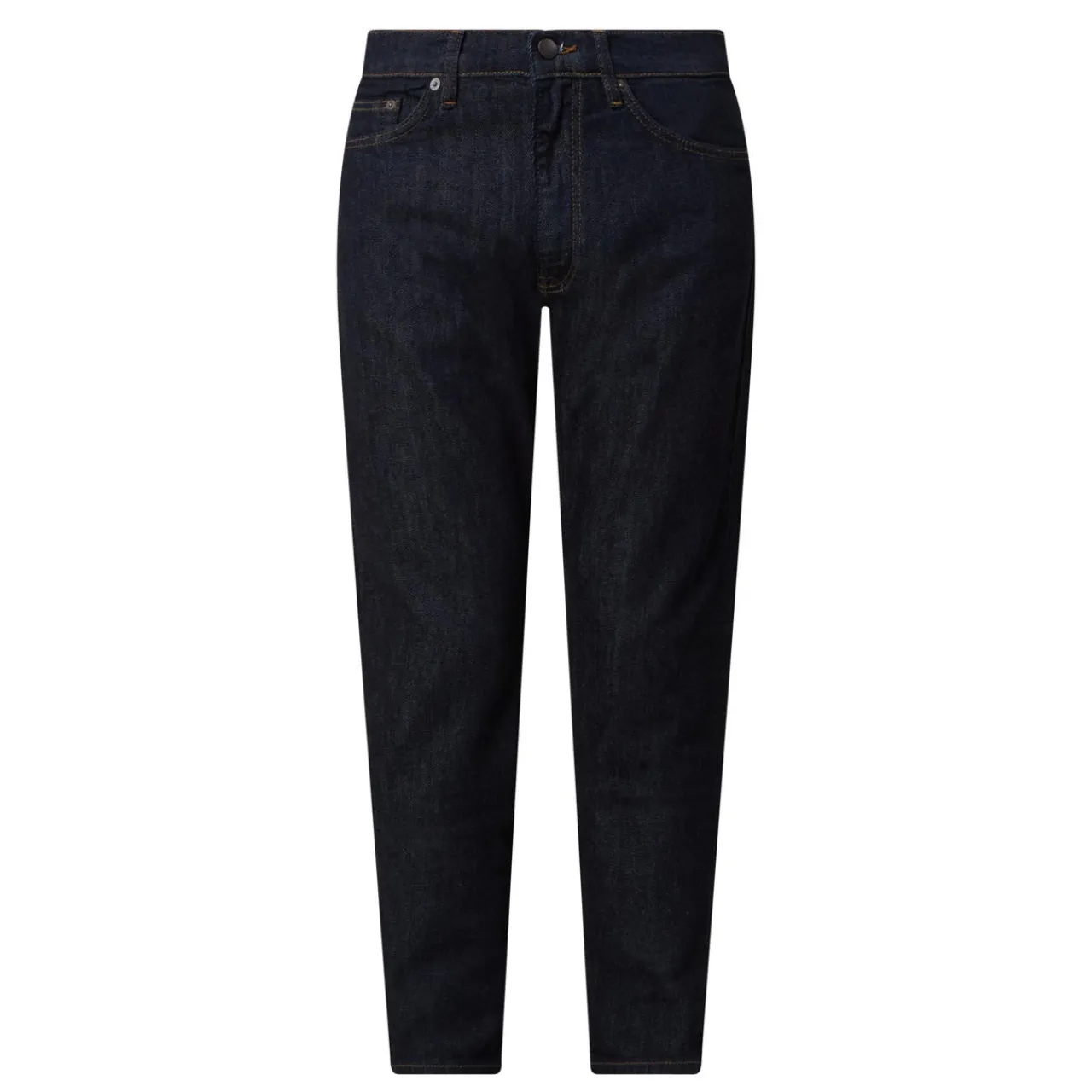 - Button and fly zipper fastening, belt loops, five pocket design, tobacco stitching, logo badge at rear