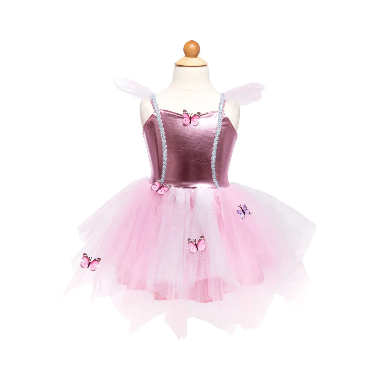 - Dress: Square neckline, thin straps with tulle detailing, sequin details, tulle skirt with butterfly embellishment, lined. Headpiece: Hairband style, butterfly, antenna and floral embellishment