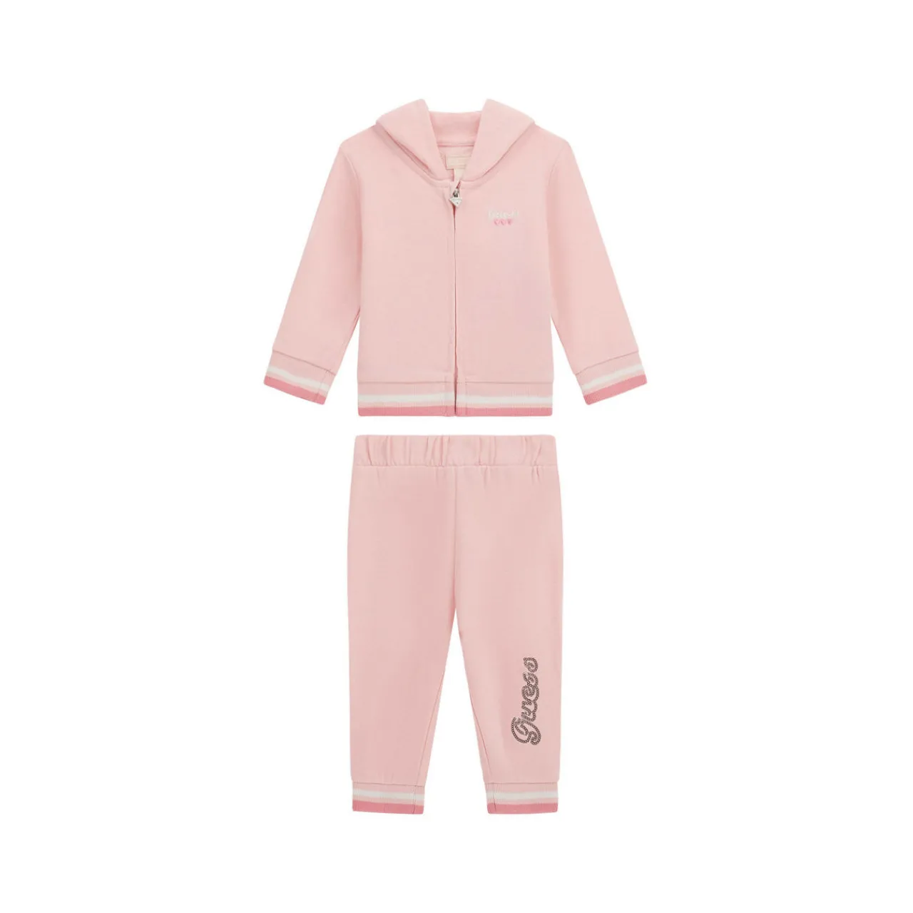 - Top: Long sleeves, hood, zip fastening, striped trims, brand logo, heart detailing, sequin logo to reverse. Bottoms: Elasticated waistband, striped ankle cuffs, brand logo detail