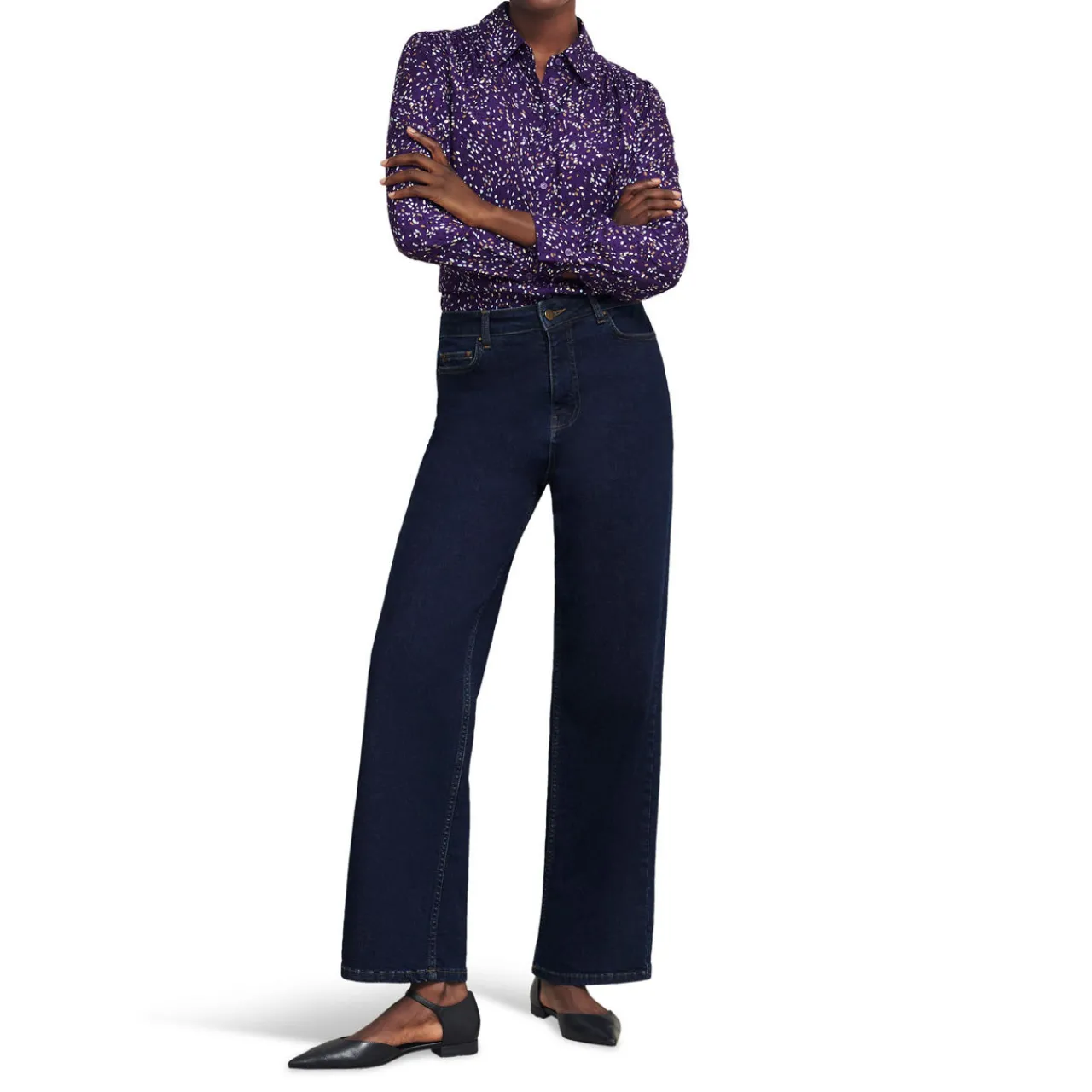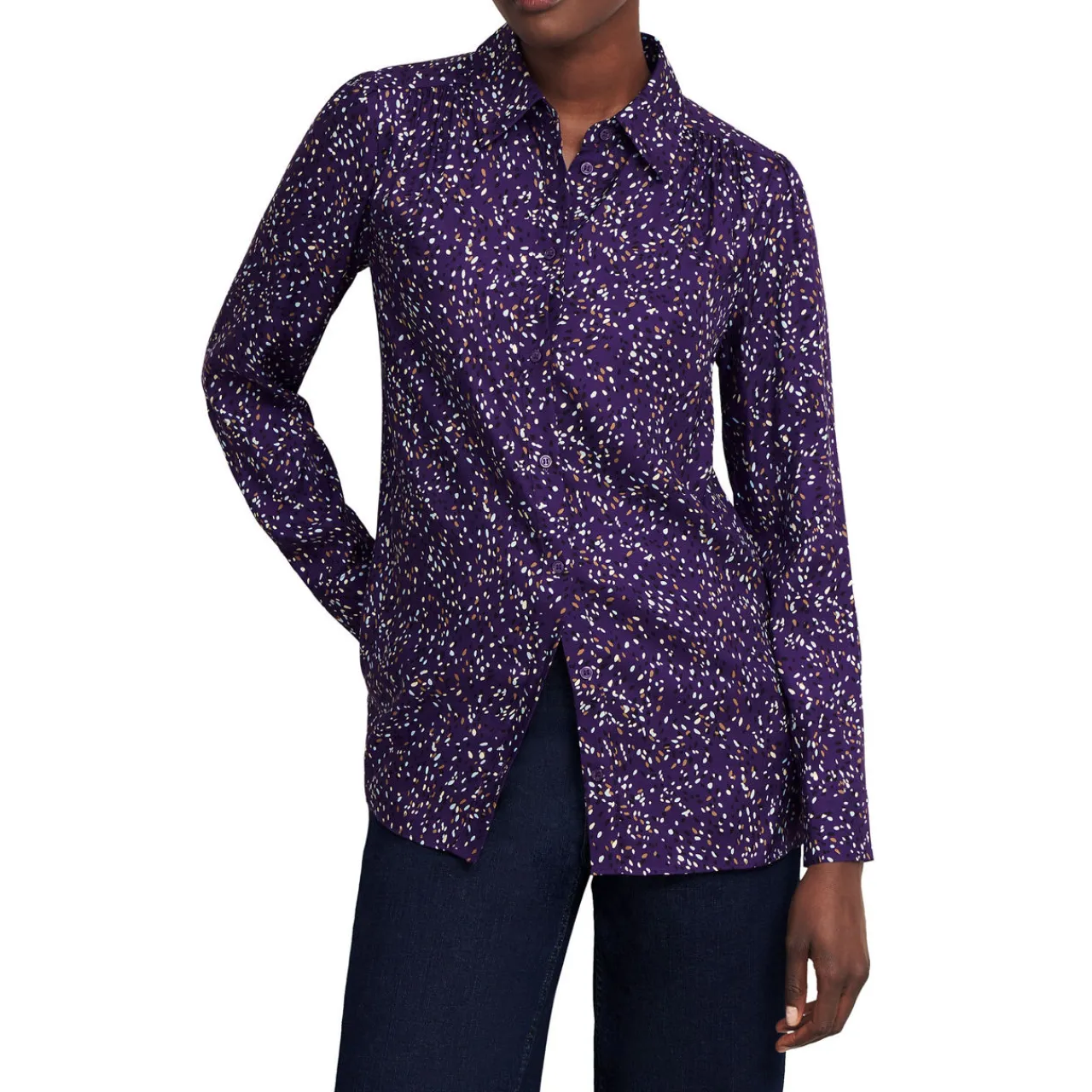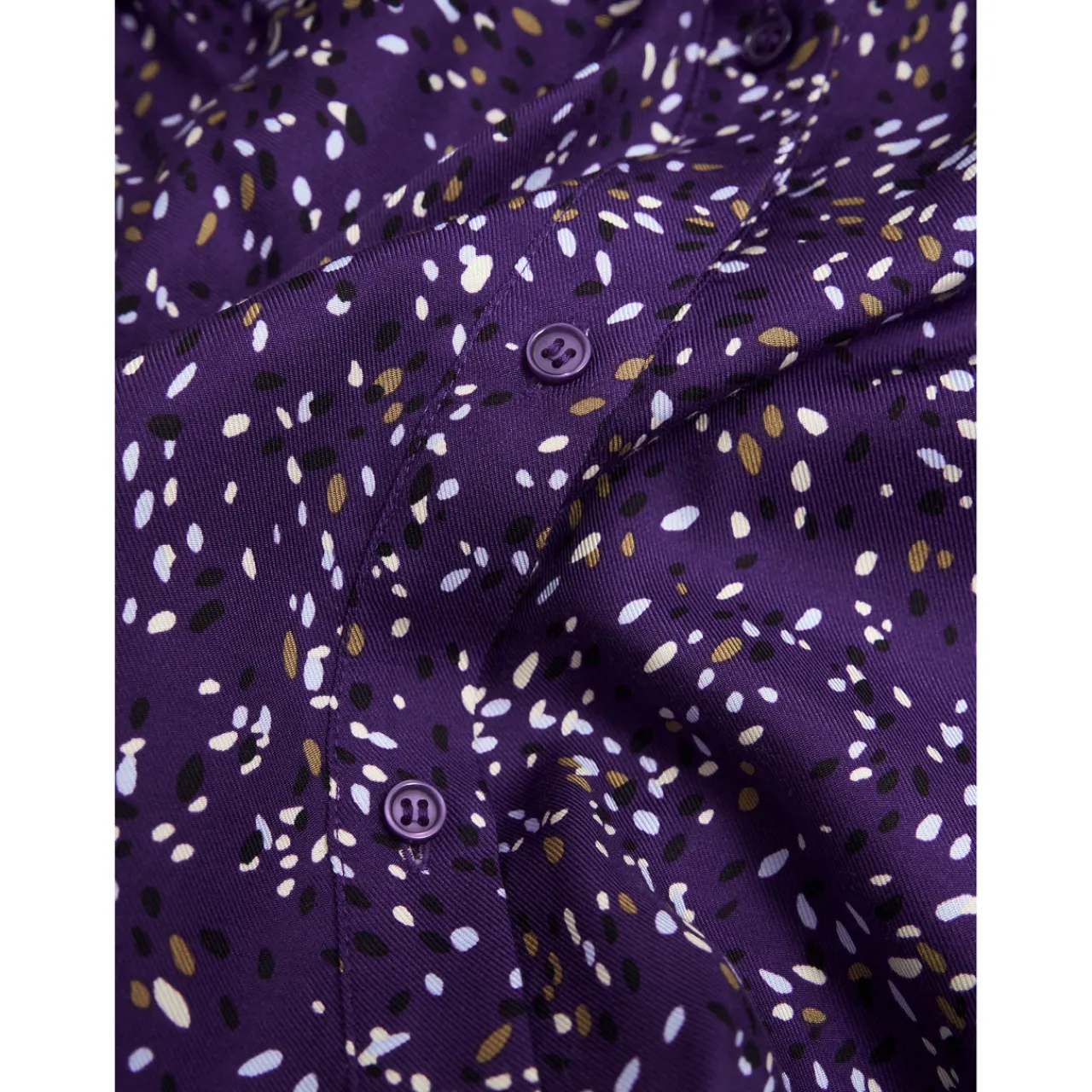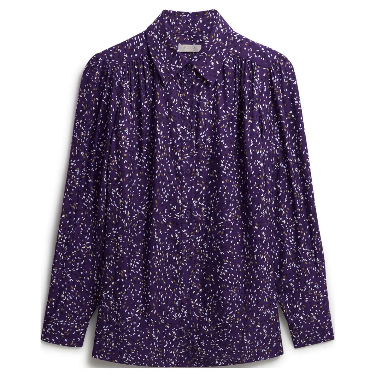 - Shirt collar, long sleeves, front button fastenings, buttoned cuffs, printed design