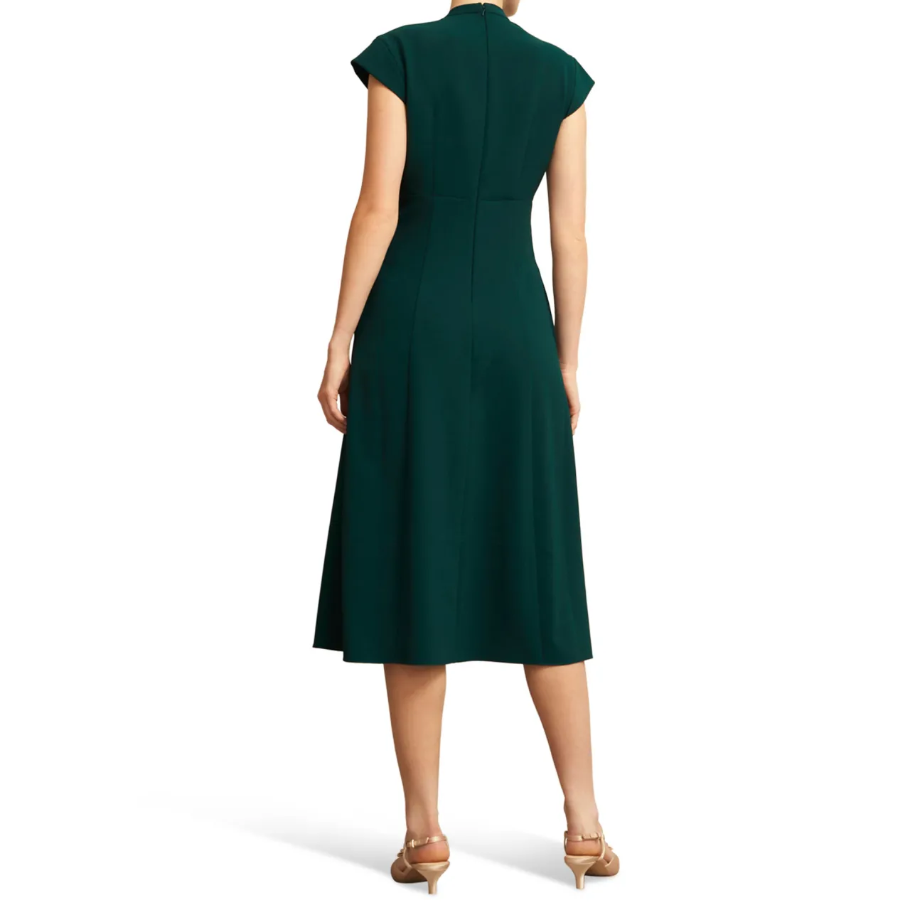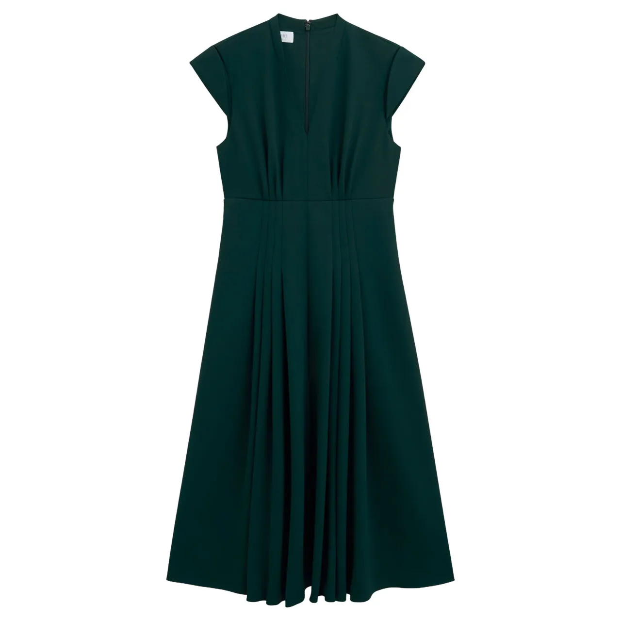 - Crepe fabric, draped, pintuck detailing, cap sleeves, side pockets, V-neckline, midi length, fit-and-flare silhouette, zip and hook fastening