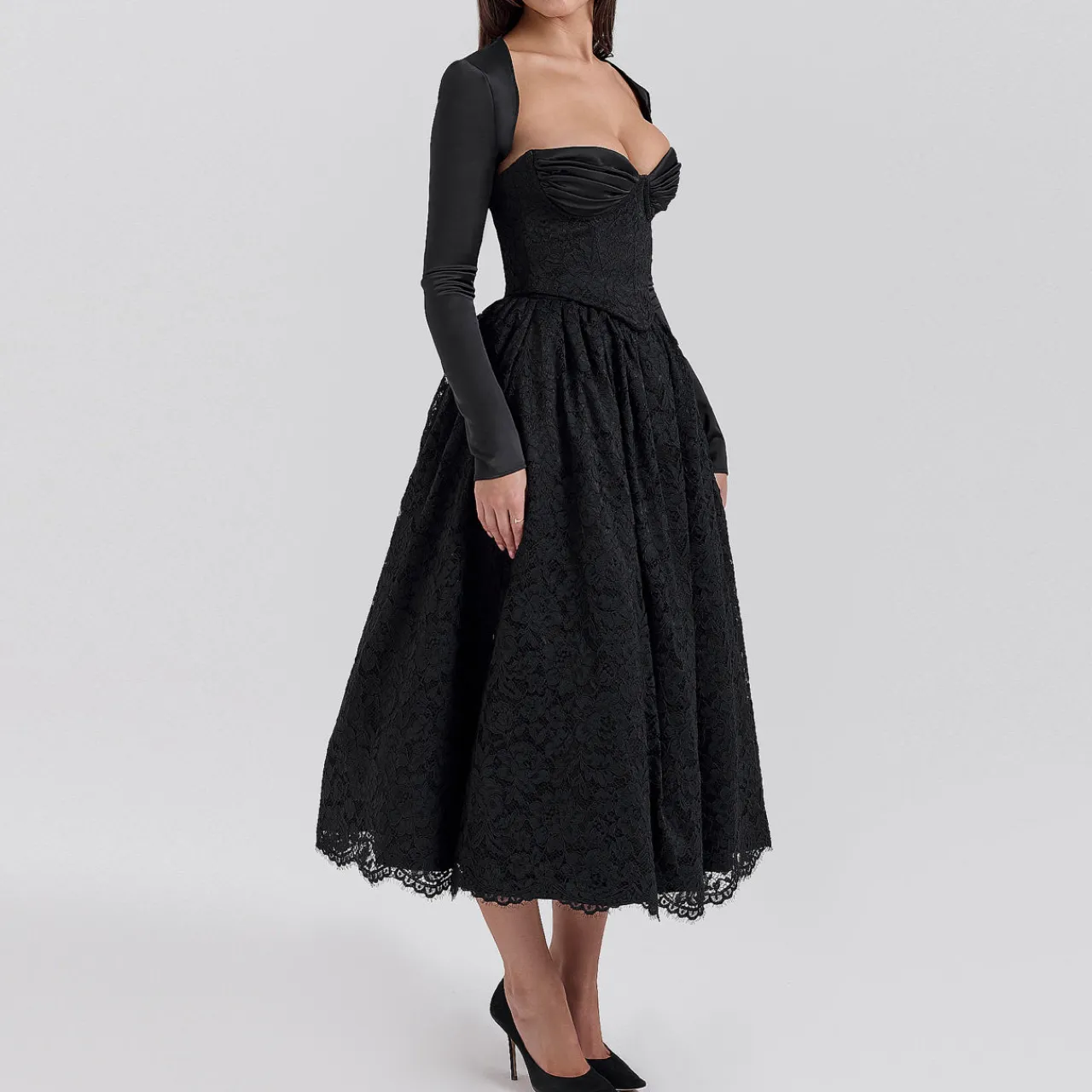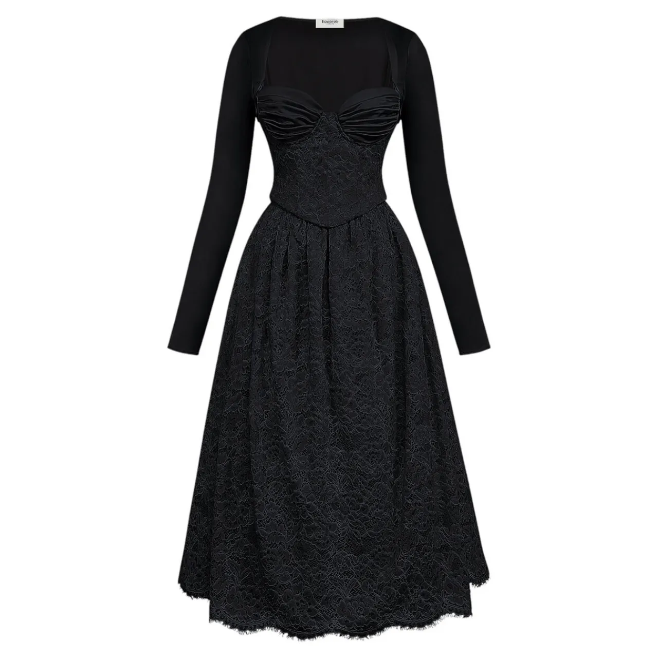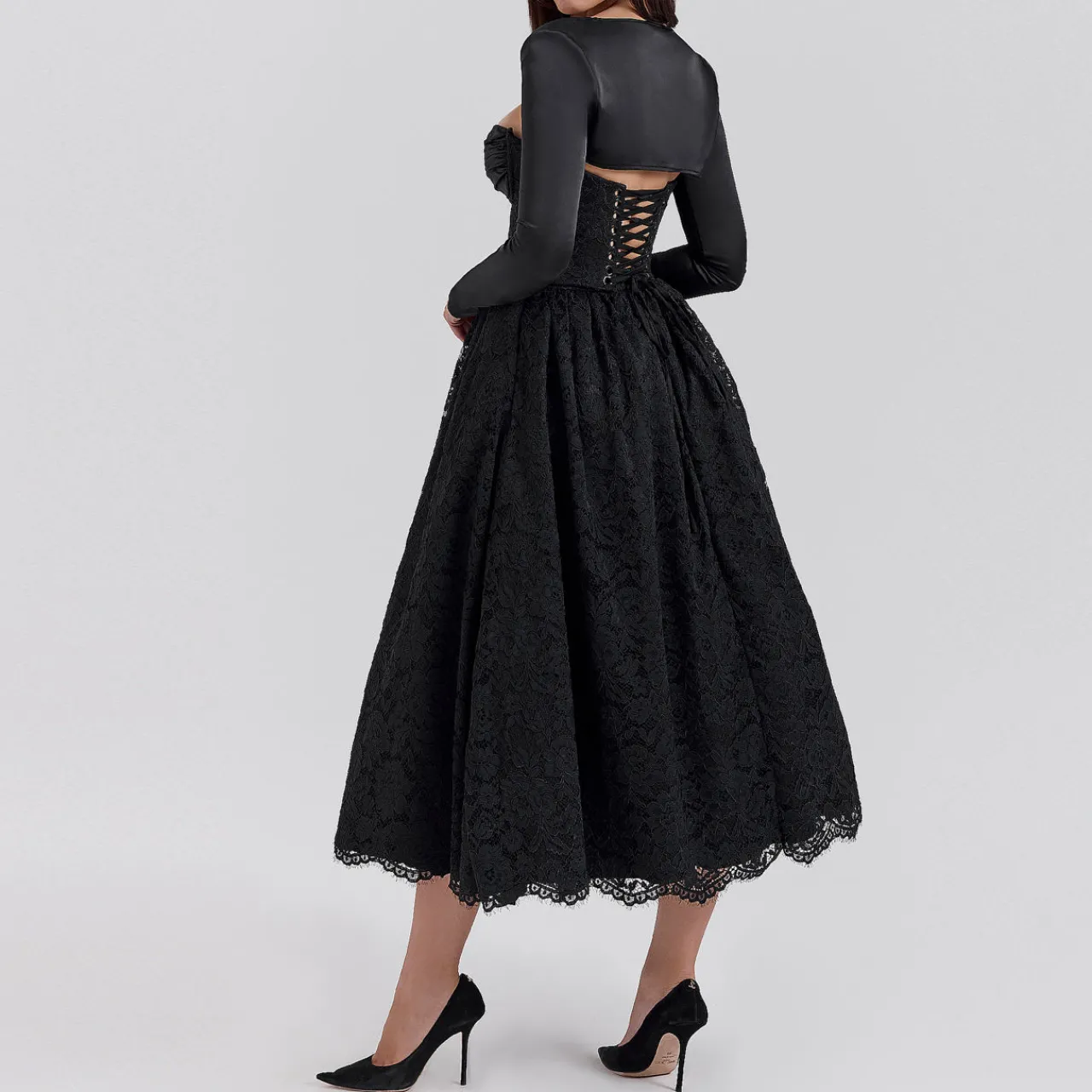- Bolero: Slip-on style, long sleeves, open-front design, smooth fabric. Corset: Structured shape, sweetheart neckline, pleated cups, back tie-fastening corset straps, floral lace design, textured finish. Skirt: Voluminous style, concealed zip-fastening closure, floral lace design, flared tulle silhouette, scalloped edges, midi length, textured finish