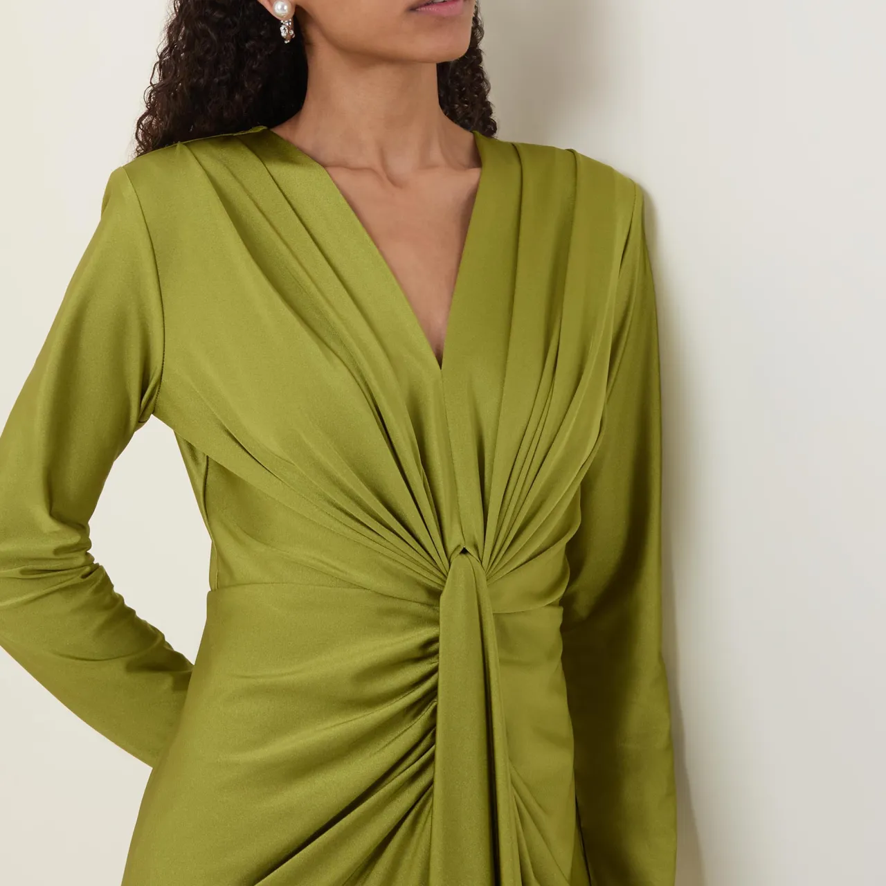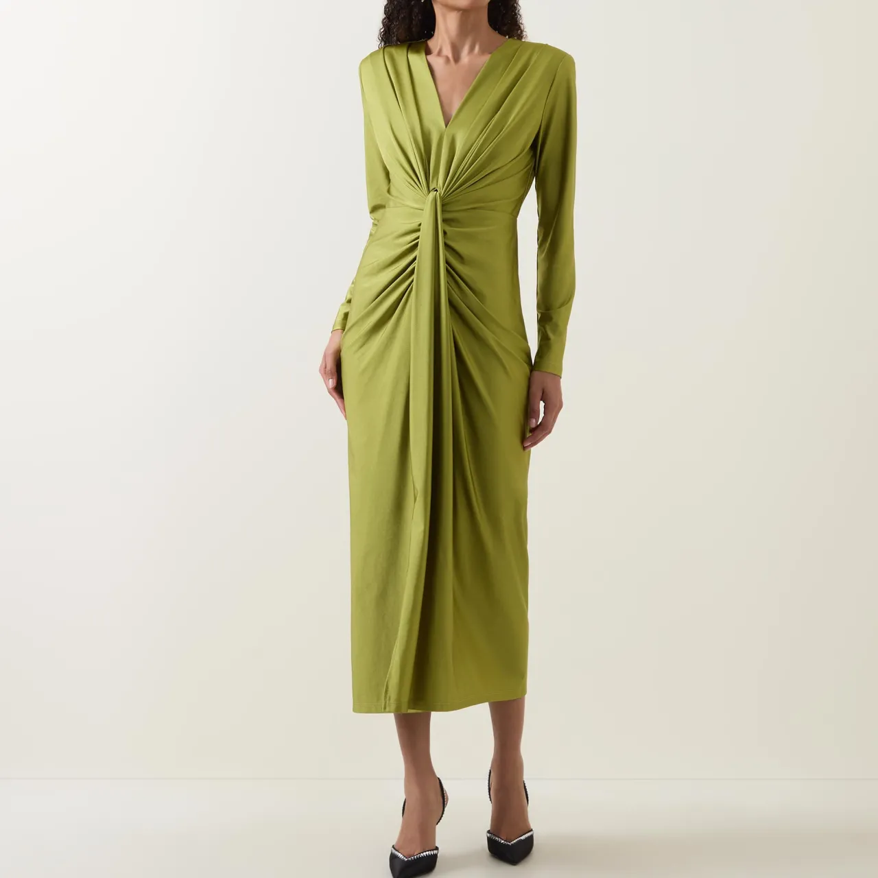 - Long sleeves, V-neckline, back zip-fastening closure, draped detail to the front, gathered waist, fitted silhouette, midi length