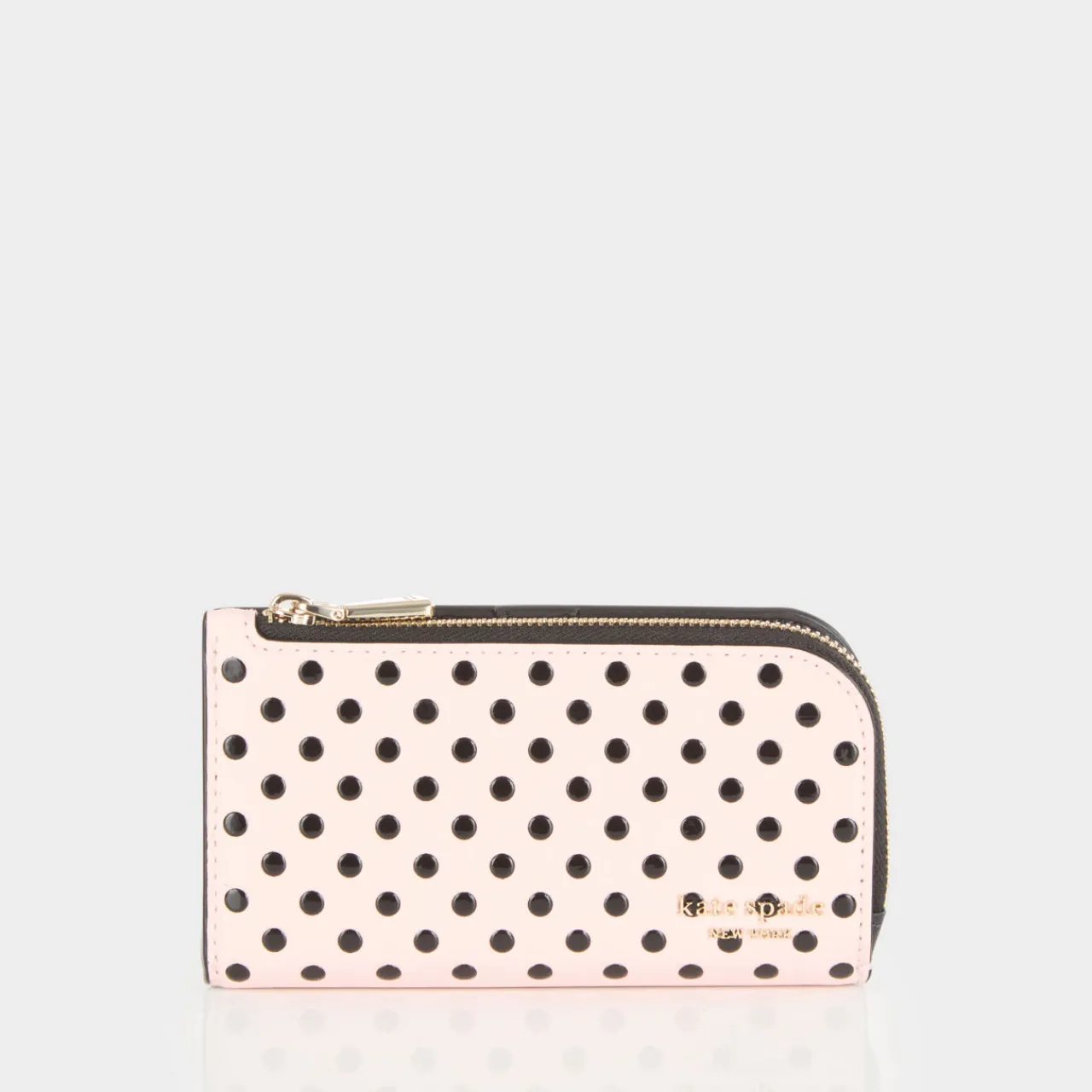 - Bifold style, zip and snap button fastening, polka dot pattern, gold-tone hardware, logo details