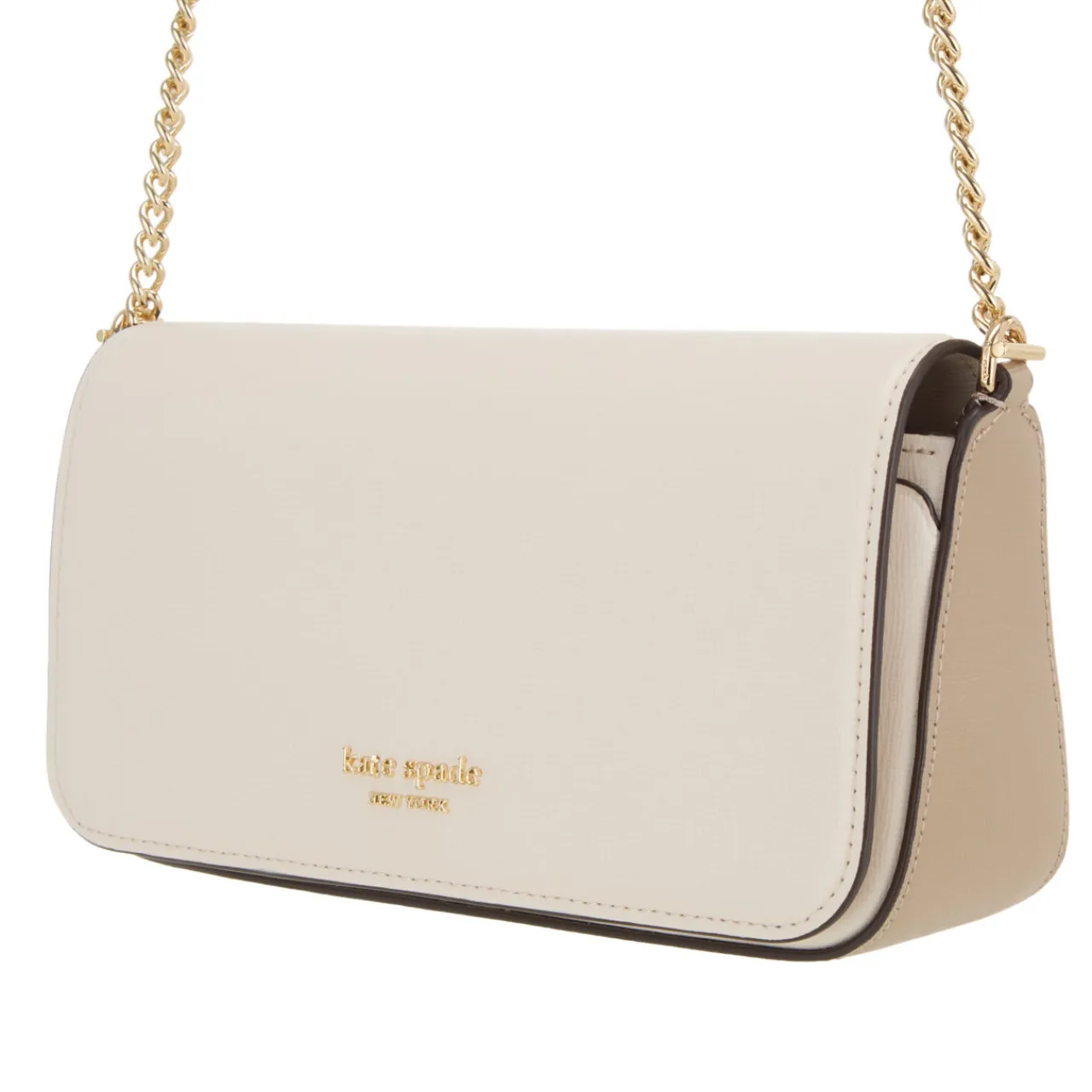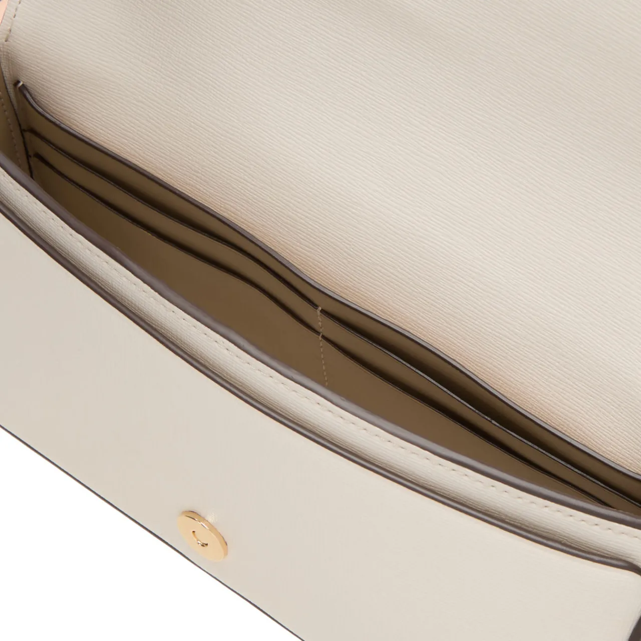 - Flap fastening with magnetic button closure, detachable chain strap, logo hardware, grained finish, gold-tone hardware