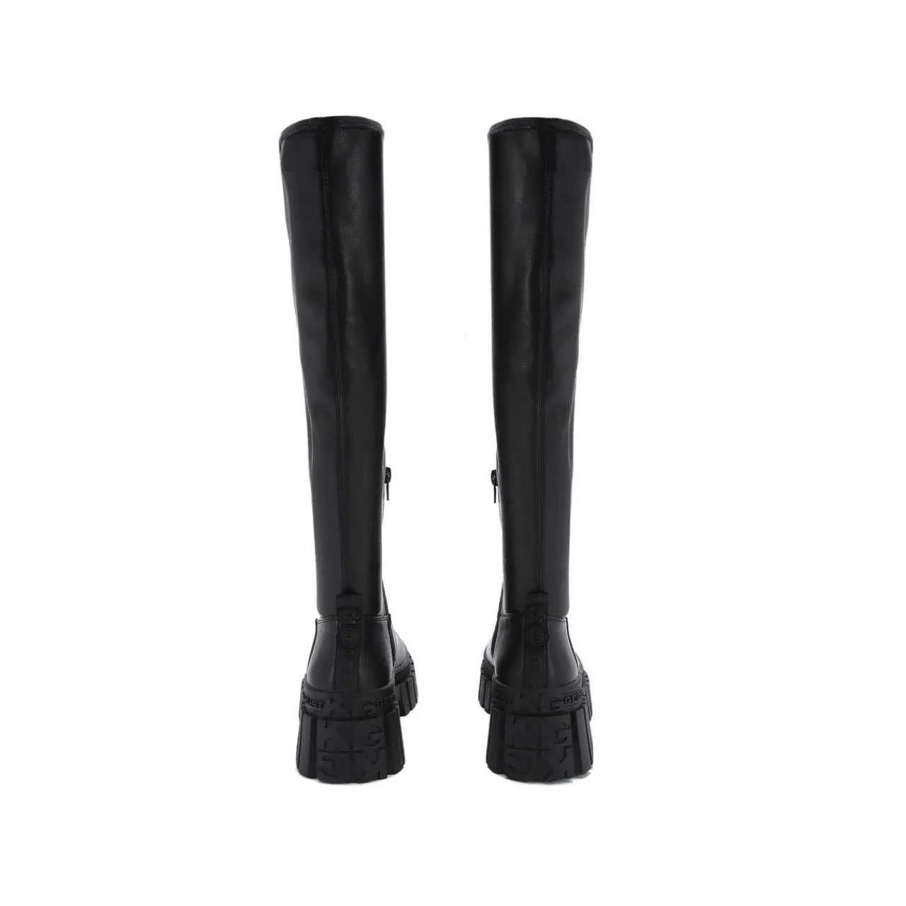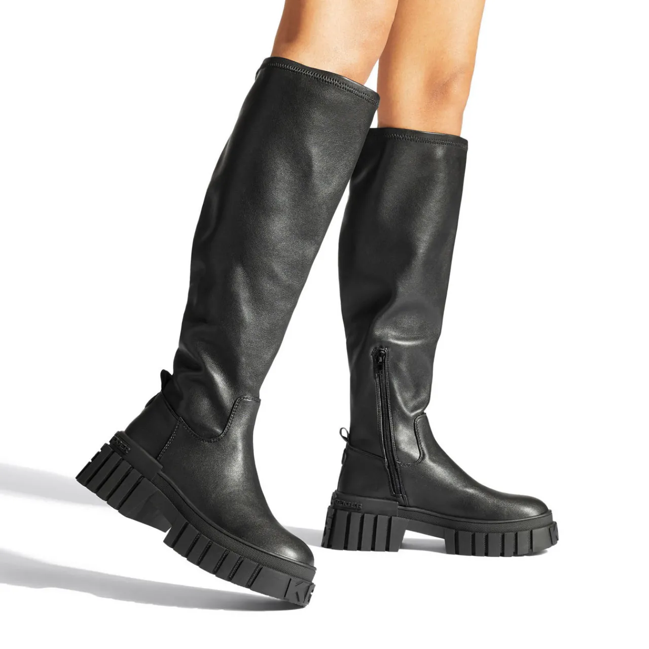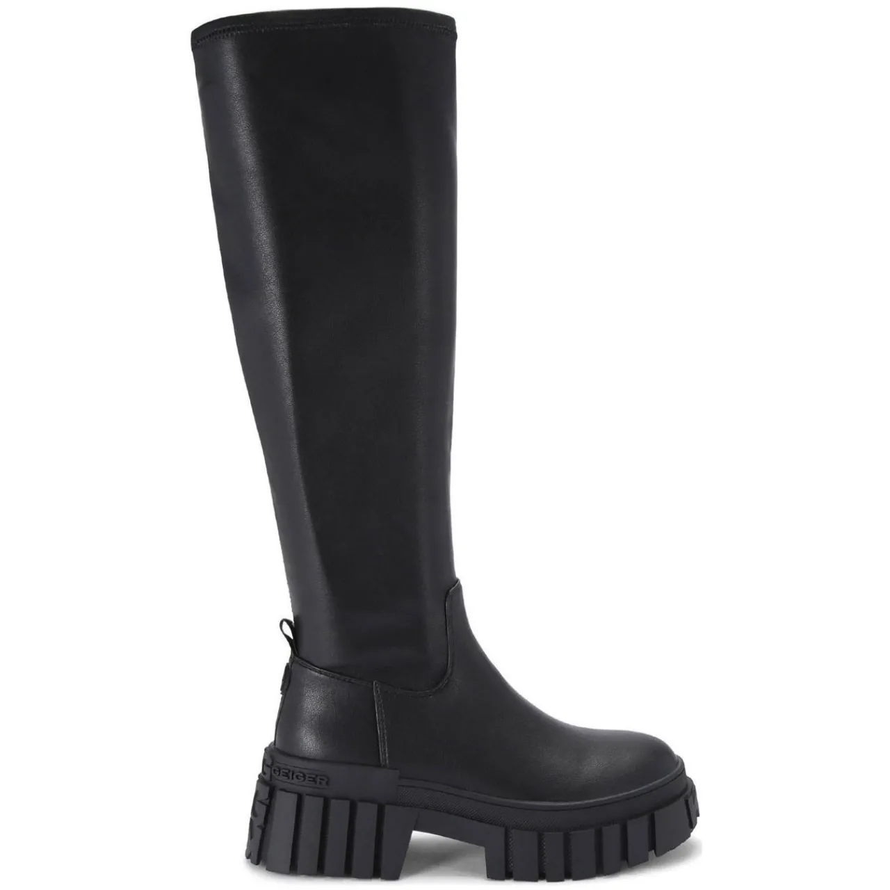 - Soft knee-high upper, round toe, chunky tread sole, branded pull tab