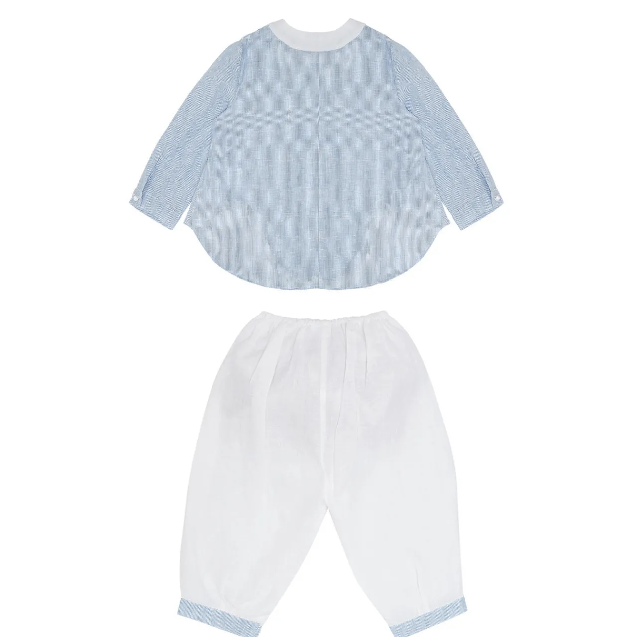 - Granddad collar, long sleeves, button fastenings, elasticated waist.