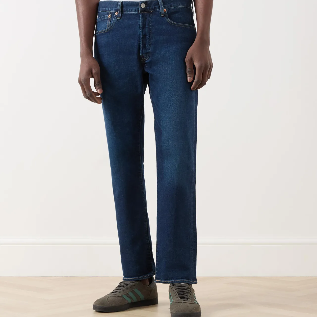 - Button and fly zip fastening, belt loops, five pocket style, whiskering and faded details, logo badge and tab at rear, tobacco stitching