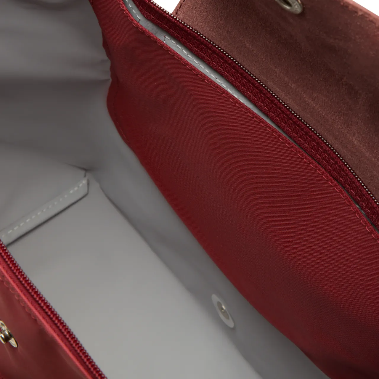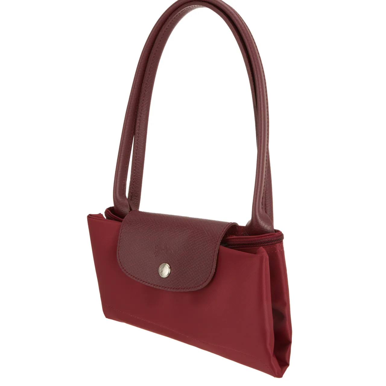 - Top handles, silver-tone hardware, flap button fastening, top zip fastening, embossed logo, embroidered logo detail, foldable, lightweight, unlined