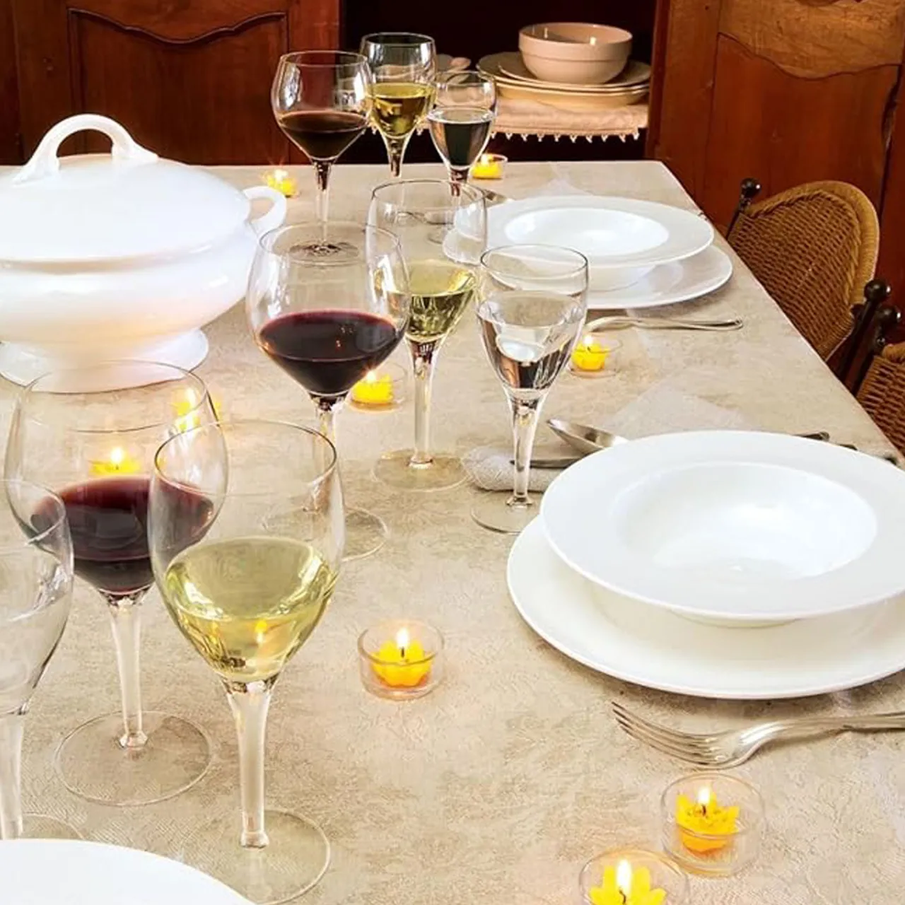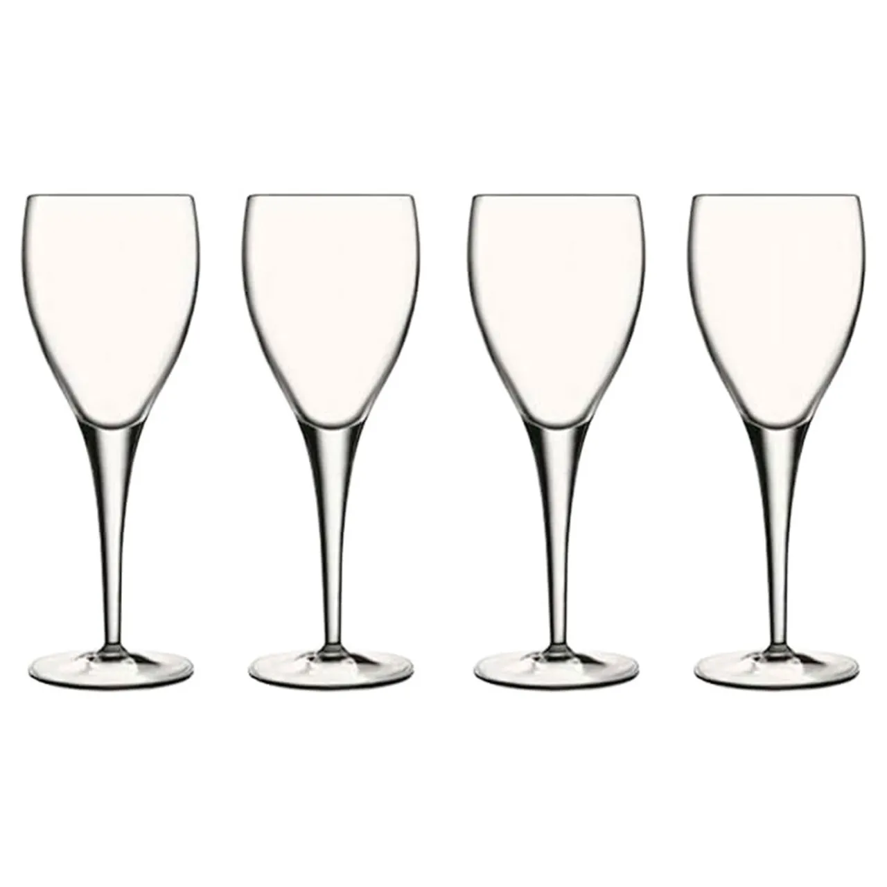 - Set of four wine glasses, crystal clear, reinforced stems, dishwasher safe