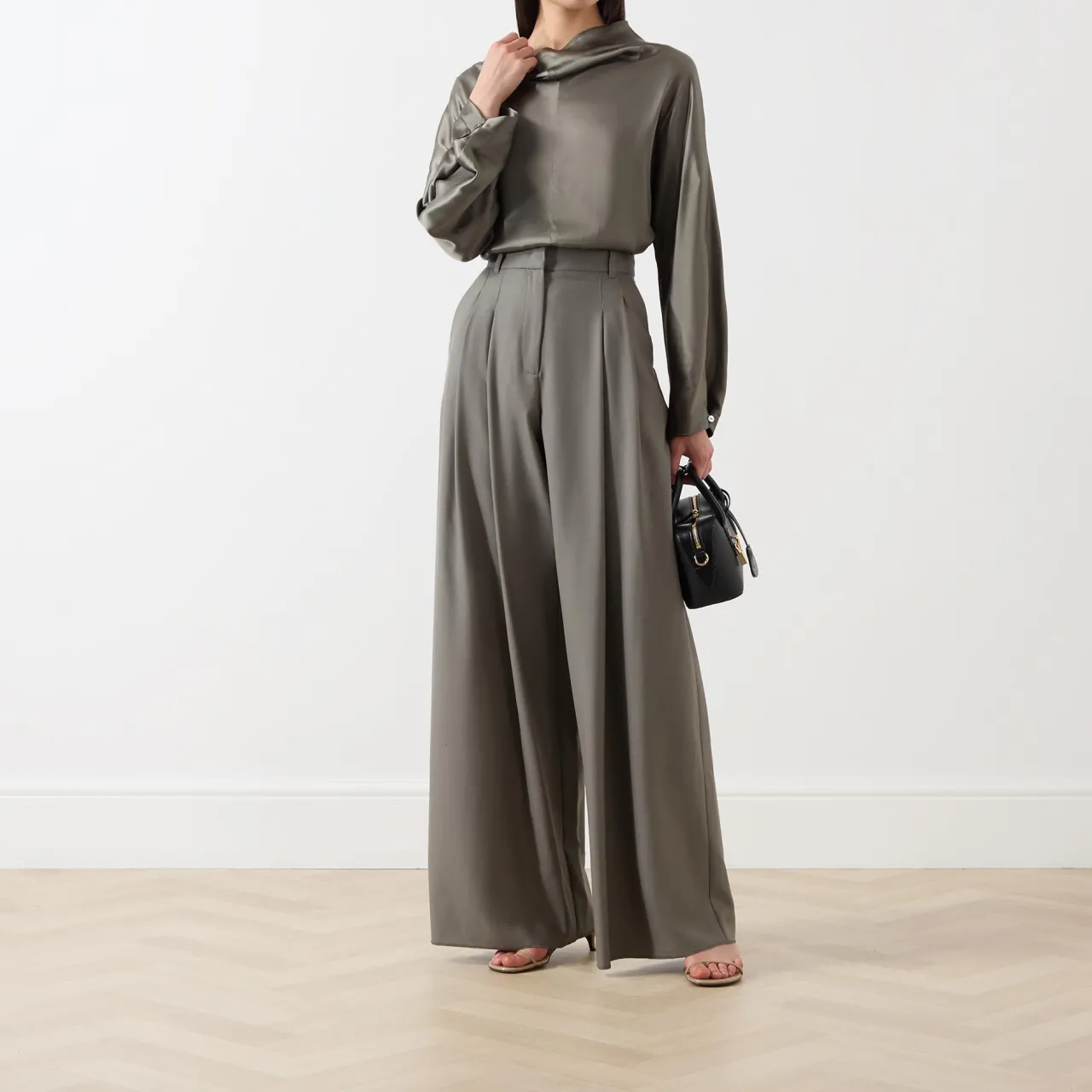 - Concealed zip-fly and hook-and-bar fastening, belt loops, two side in-seam pockets, two rear welt pockets, D-ring detail to the back, pressed creases, high-rise, wide-cut leg, smooth fabric