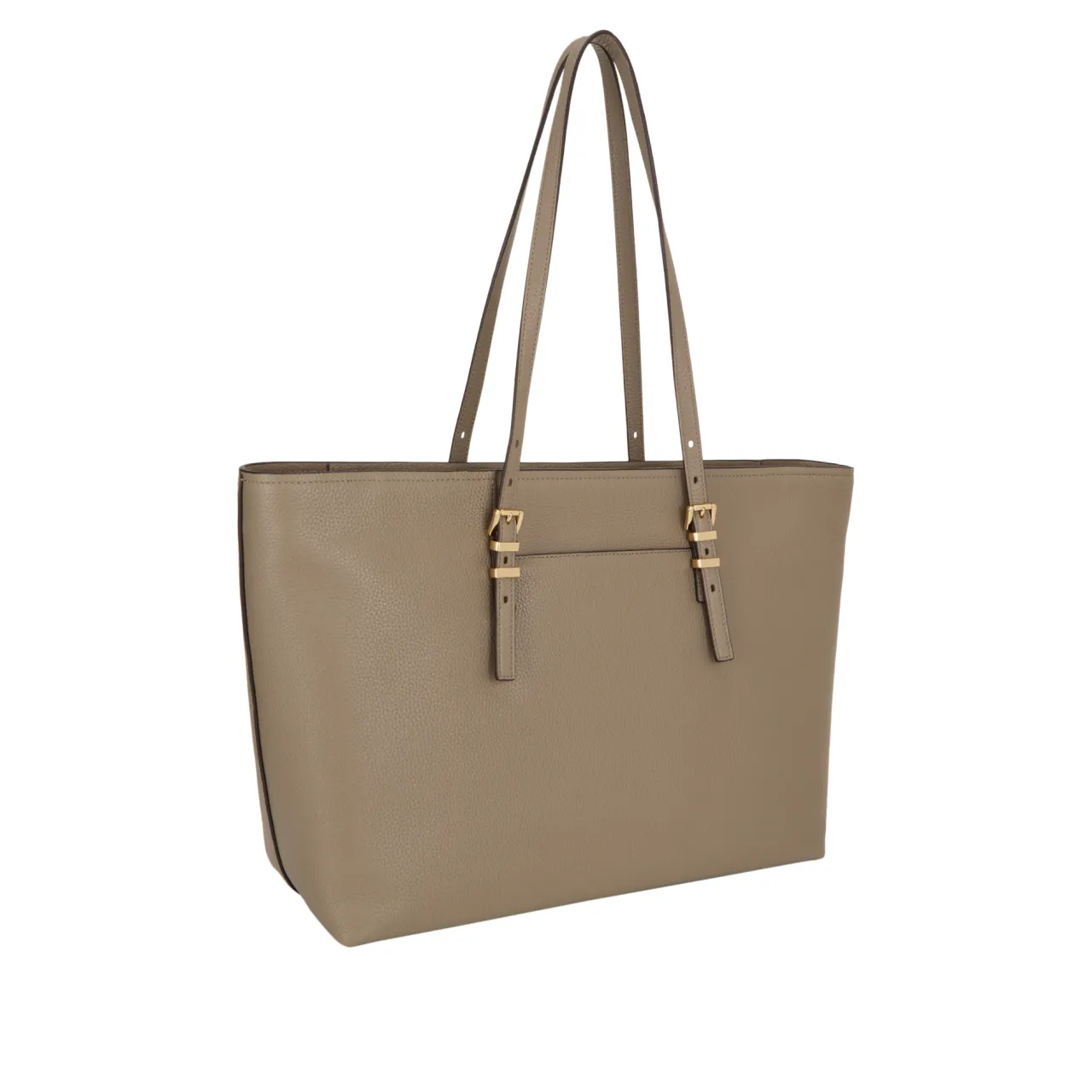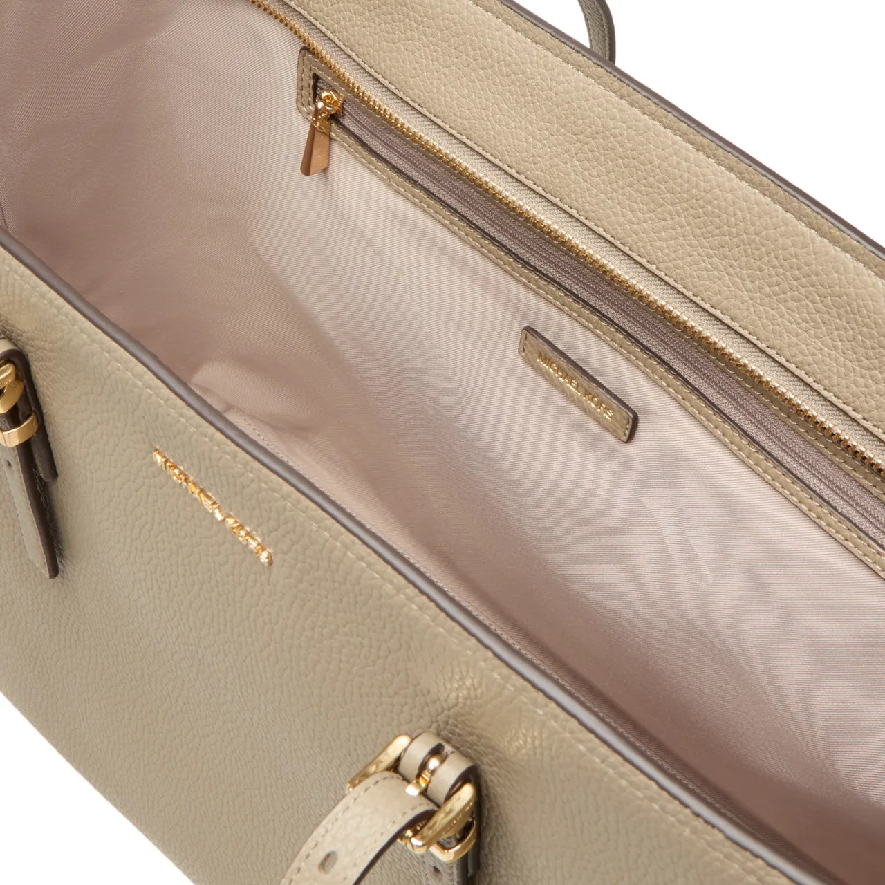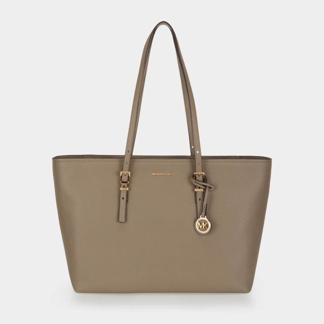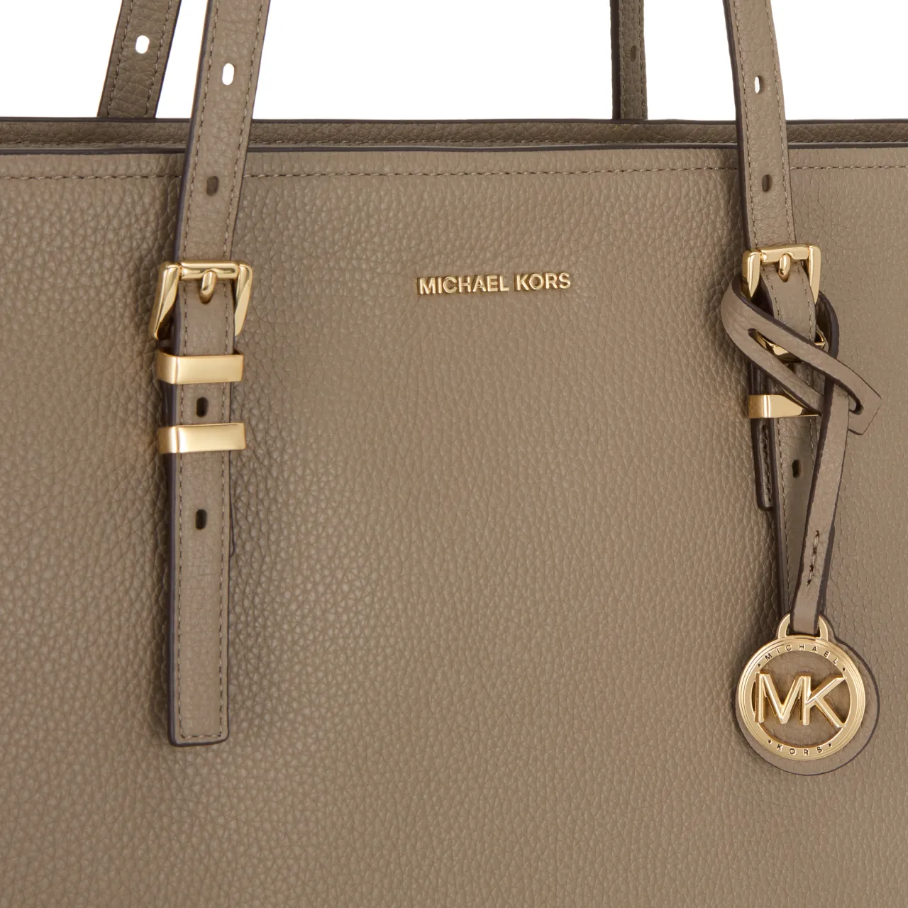 - Adjustable shoulder straps with buckle fastenings, top zip closure, one rear slip pocket, logo lettering, gold-tone hardware, hanging MK logo charm, tonal stitching, pebbled leather finish