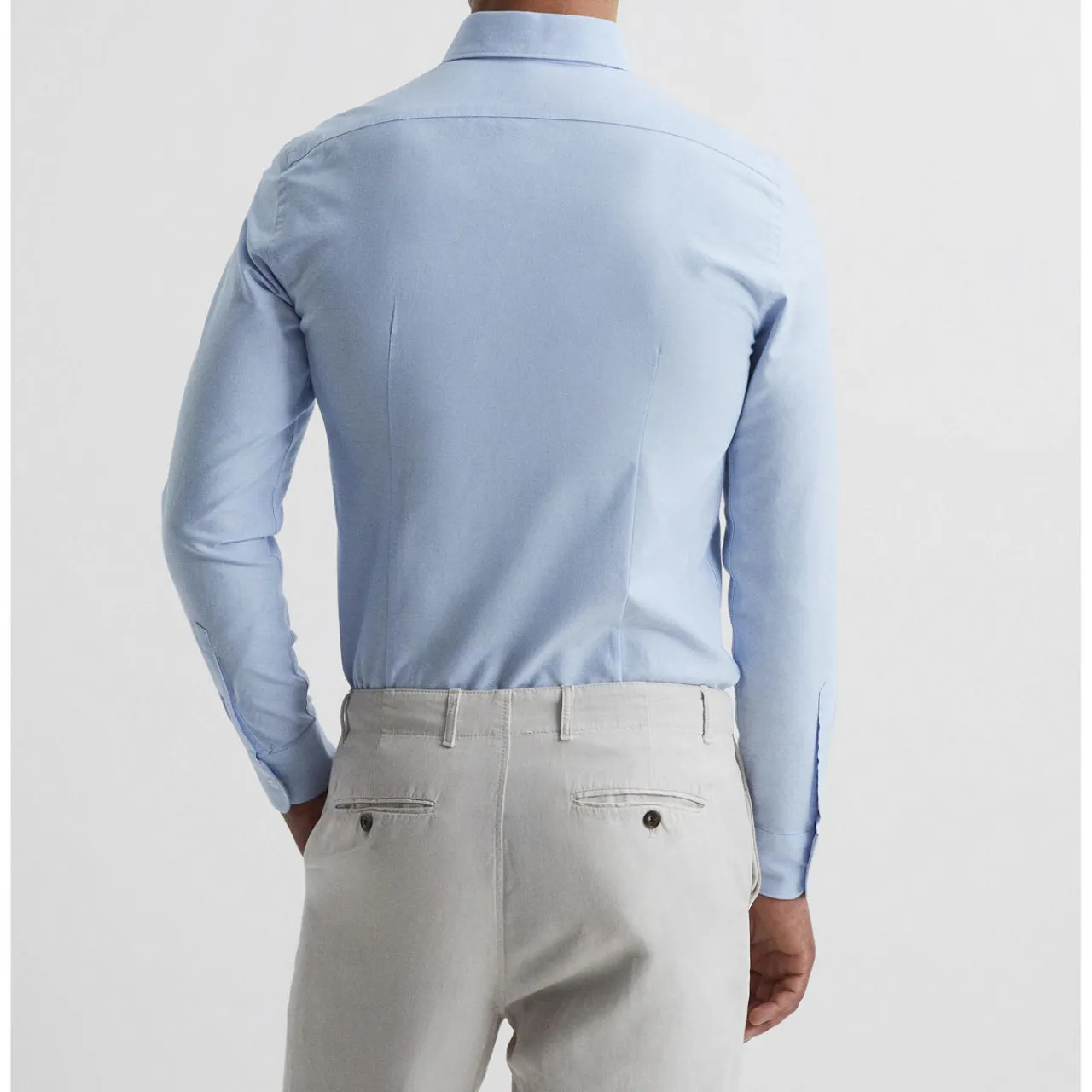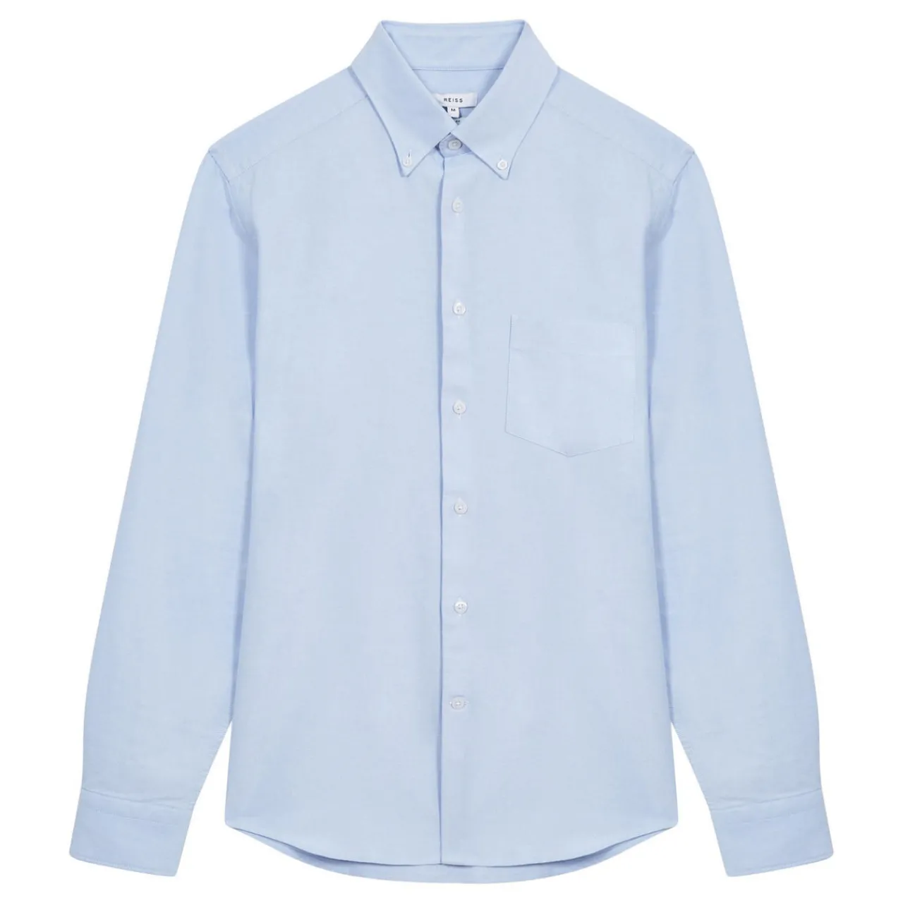 - Two-ply cotton, Oxford style, soft-wash finish, button-down collar, patch pocket to left chest plate, long sleeves, buttoned cuffs