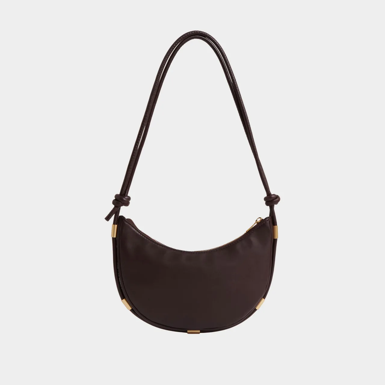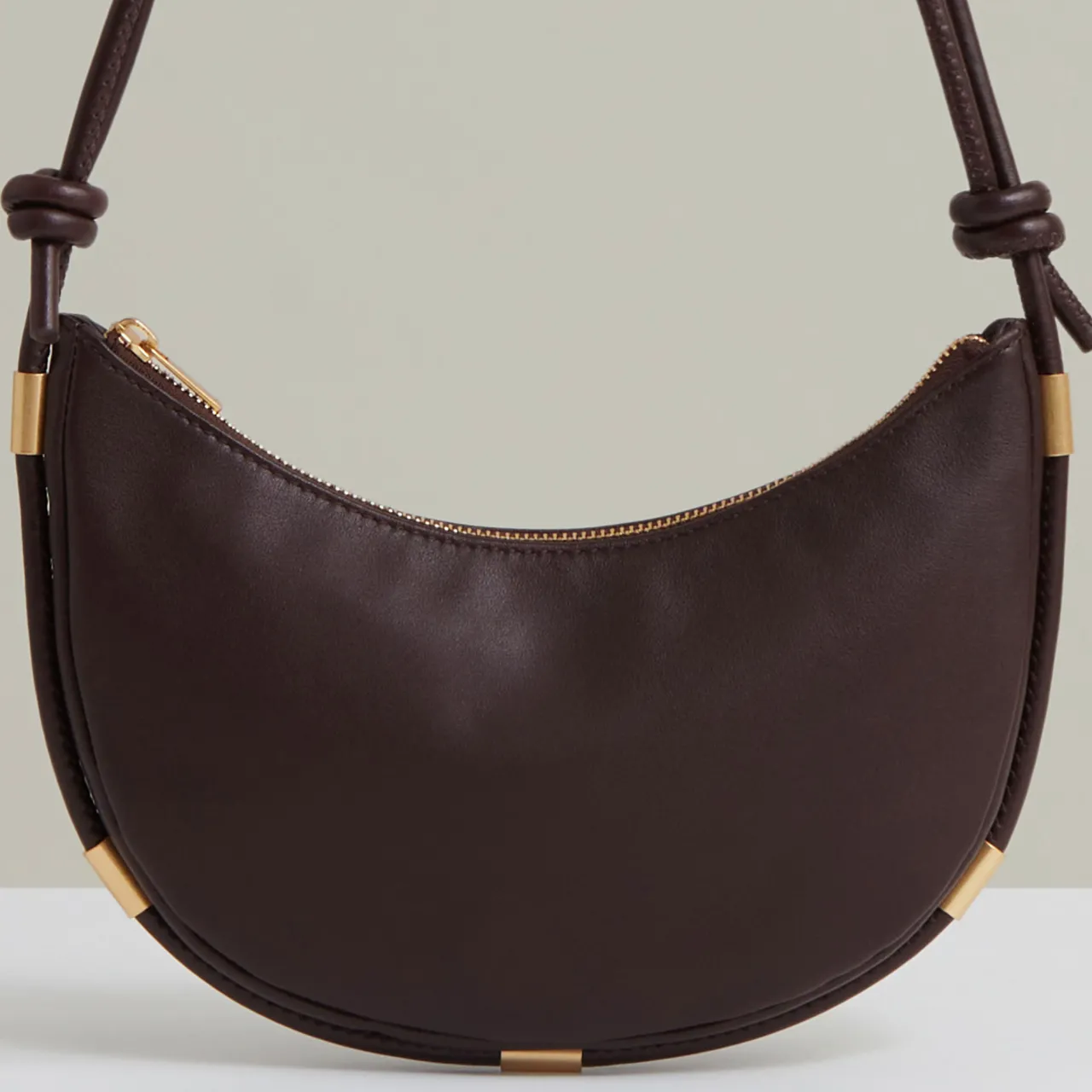 - Smooth leather, adjustable knotted shoulder strap, polished hardware, zip closure