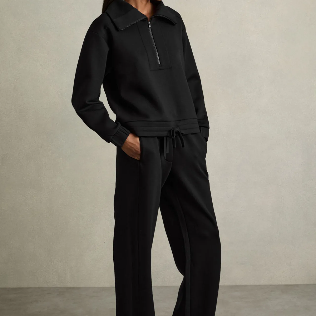 - Half zip fastening, high neckline, long sleeves, ribbed trims, drawstring adjustable hemline, fitted cuffs