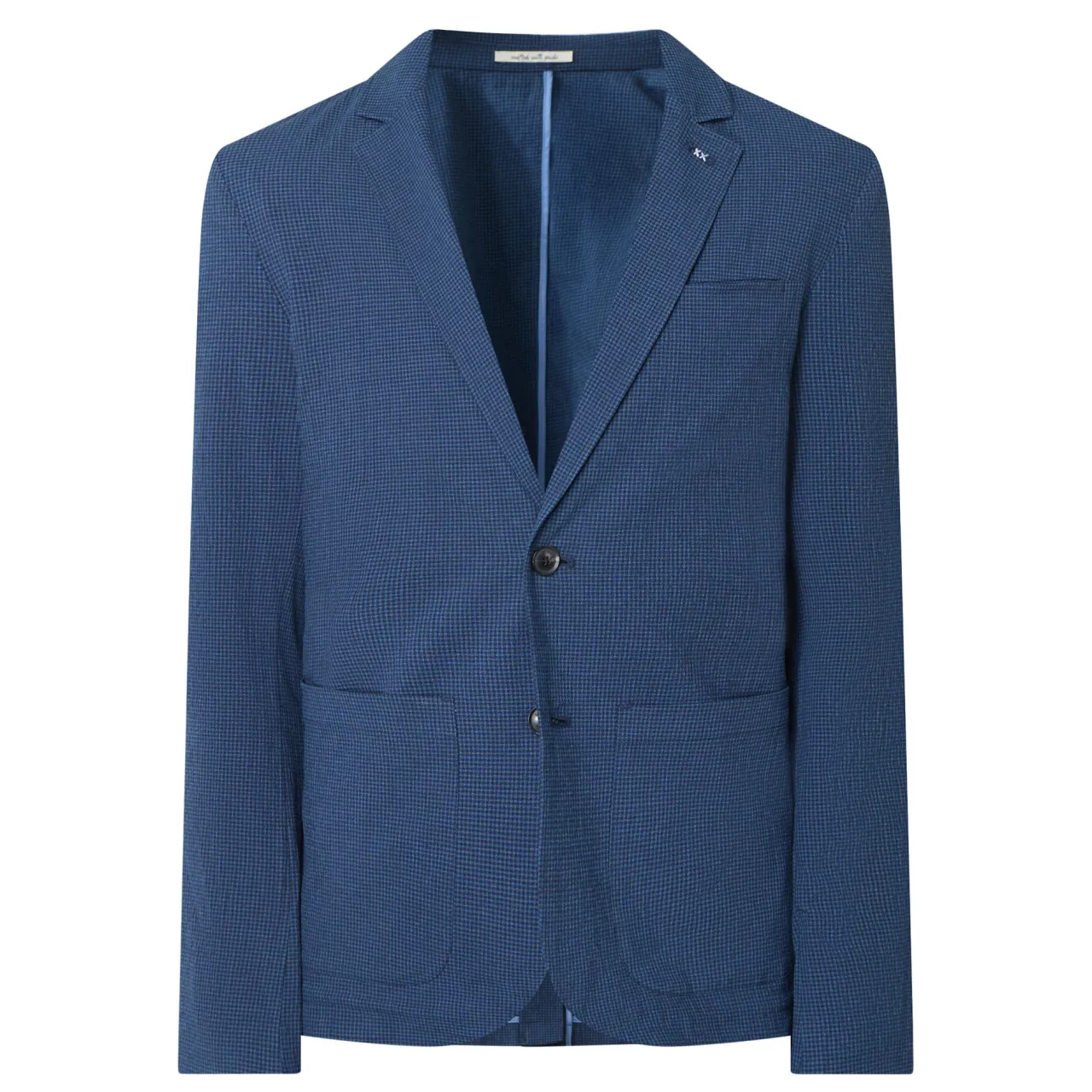 - Single-breasted, notched lapels, slip pockets, chest pockets, seersucker check design, long sleeves