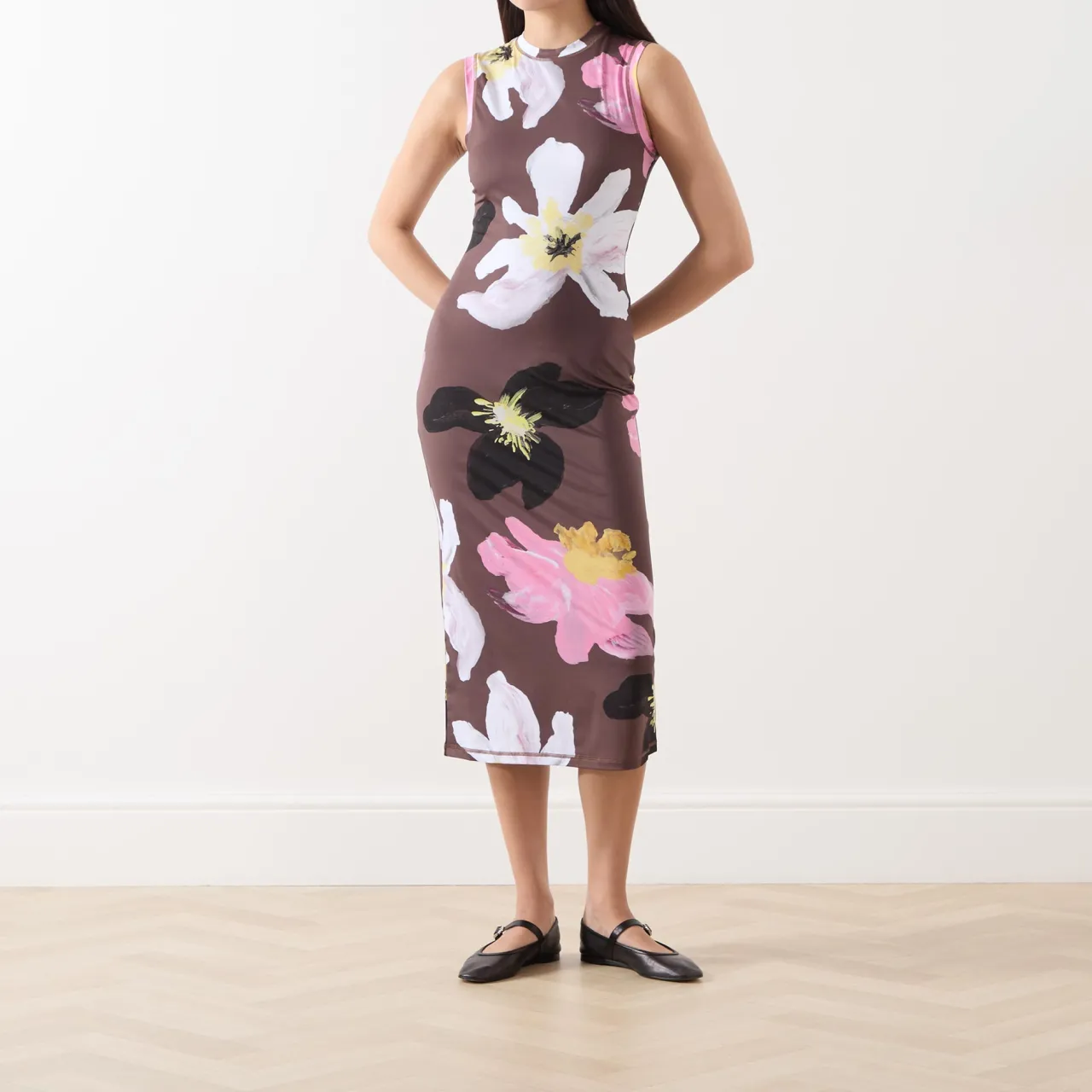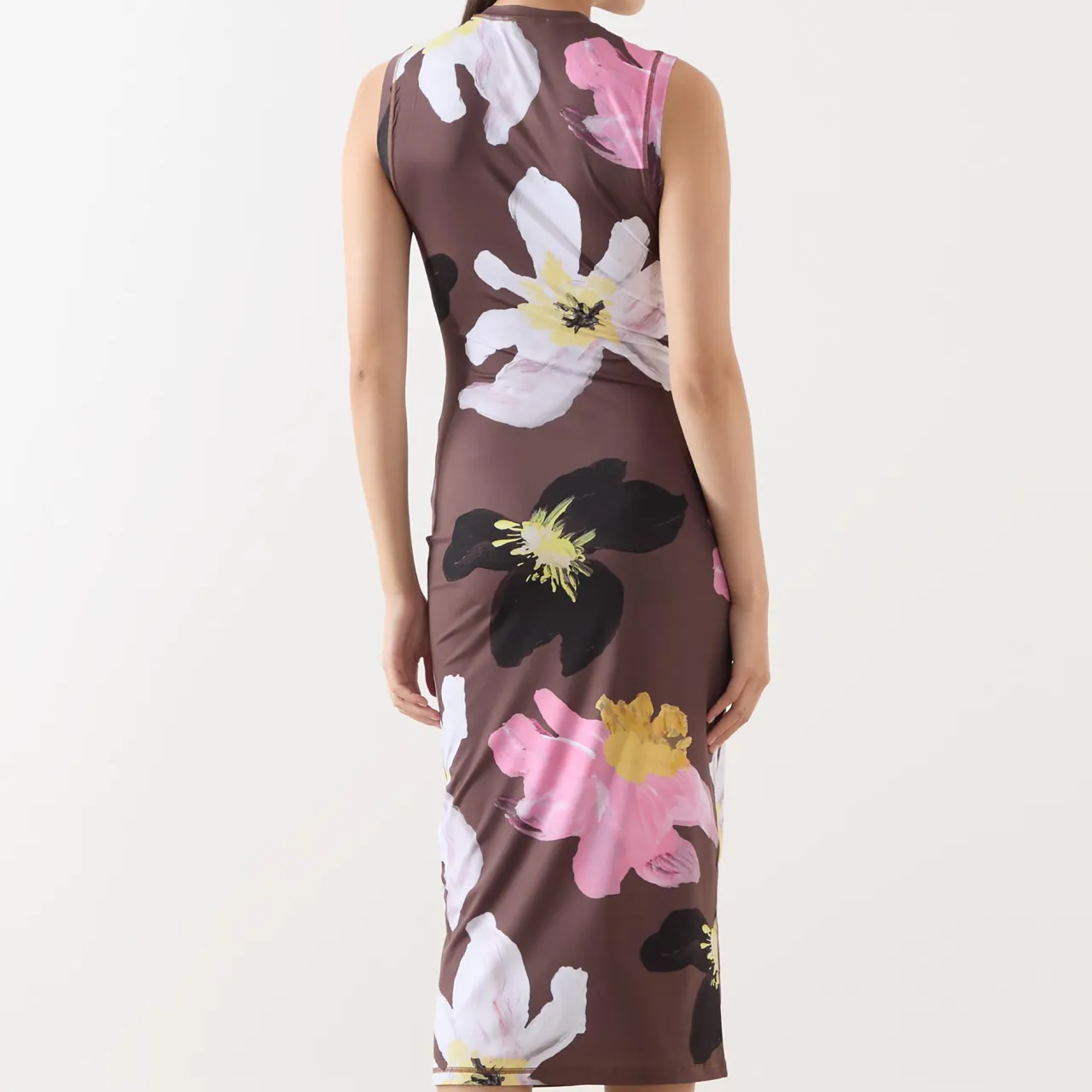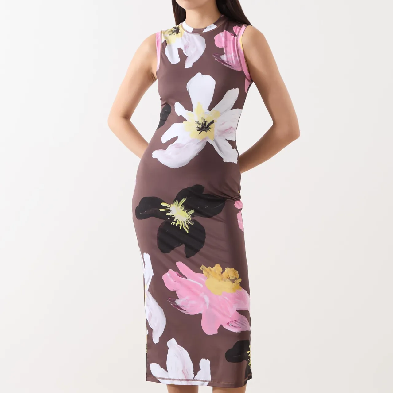 - Crew neck, sleeveless design, fitted design, straight hem, hand-painted floral print, midi length, stretchy fabric
