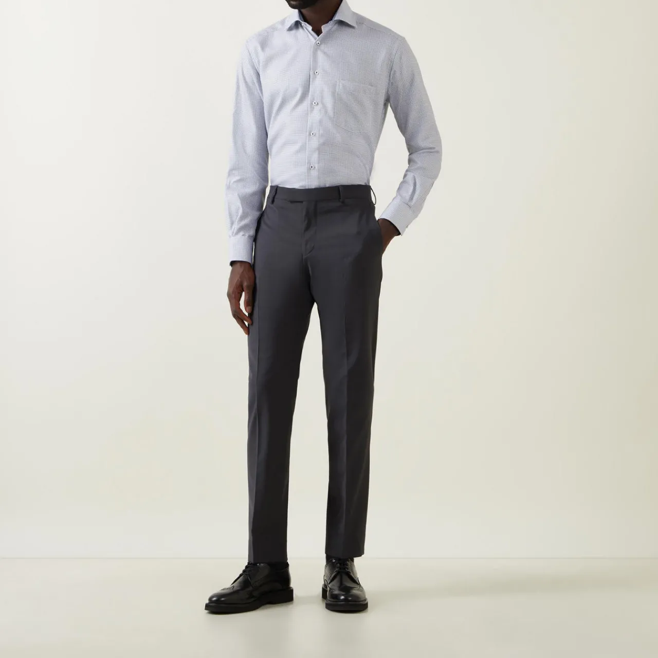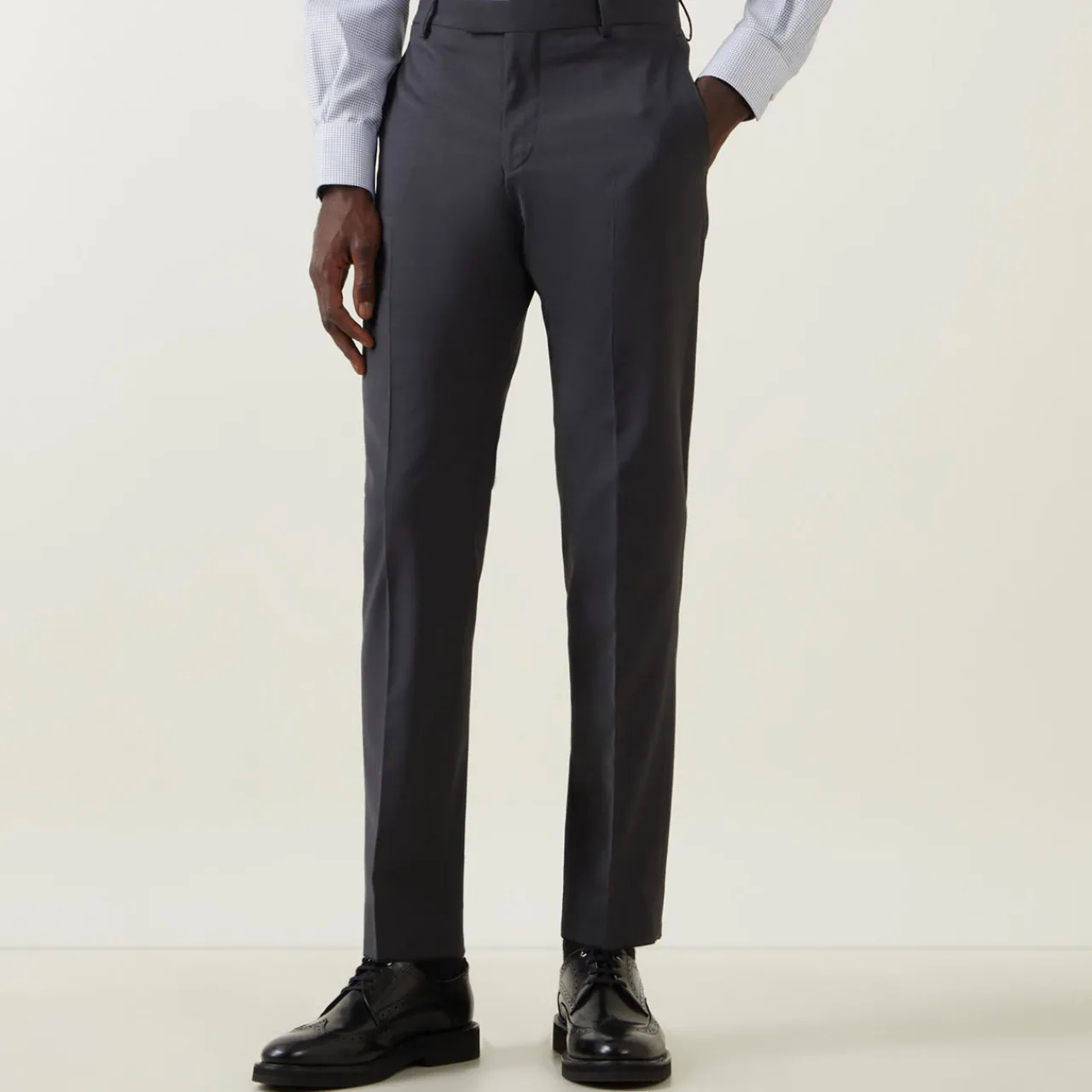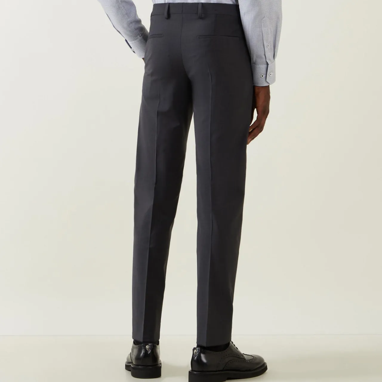- Concealed zip-fly and button fastening, belt loops, four-pocket design, pressed creases, smooth fabric