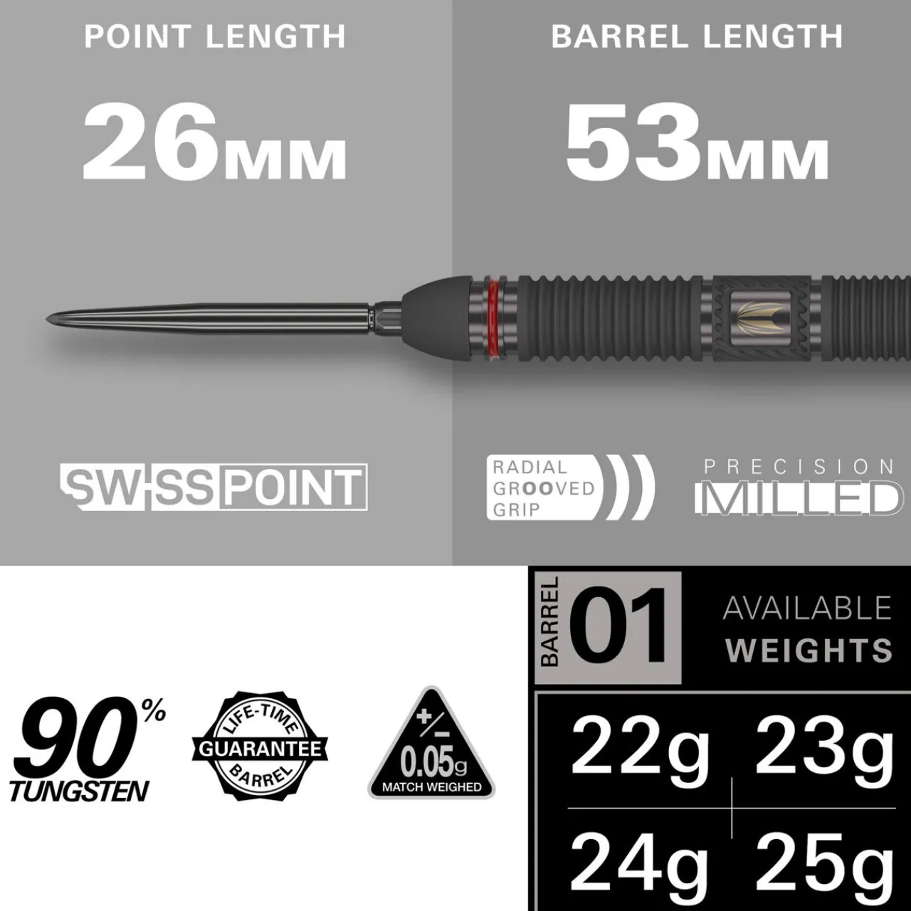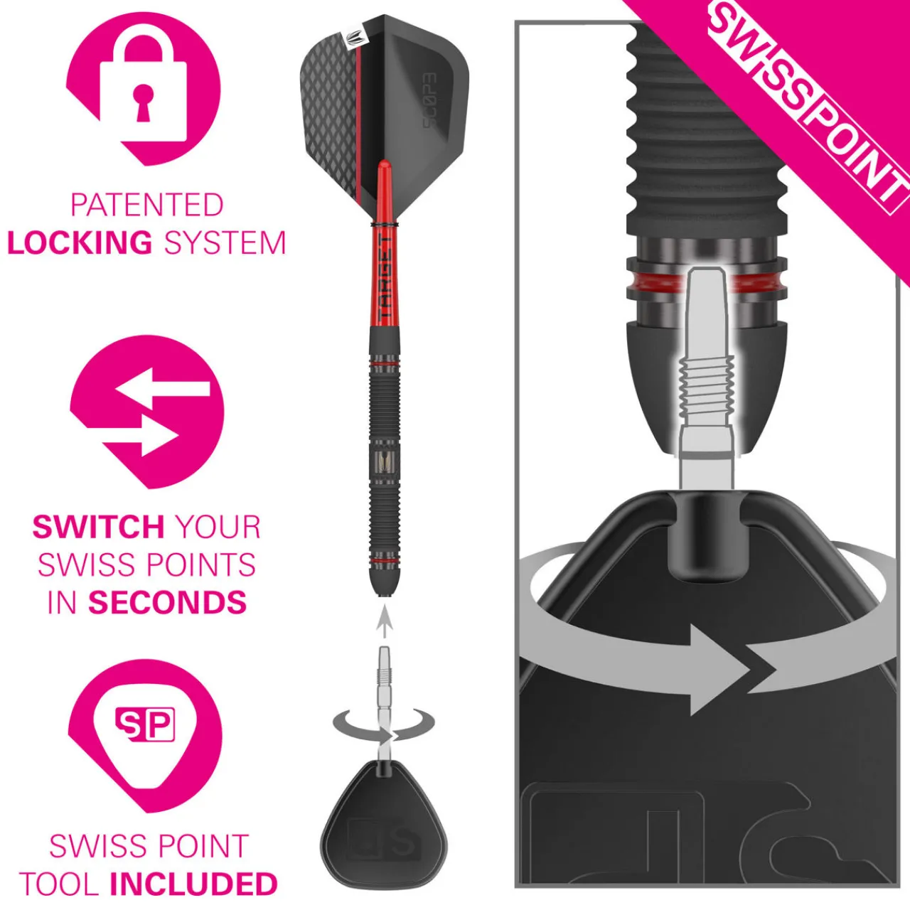 - Three 90% Tungsten Scope dart barrels, three 26mm Black Smooth Swiss Points, three Short Pro Grip Tag Shafts (34mm), three Pro Ultra Scope No.6 Flights, one Swiss Point Tool