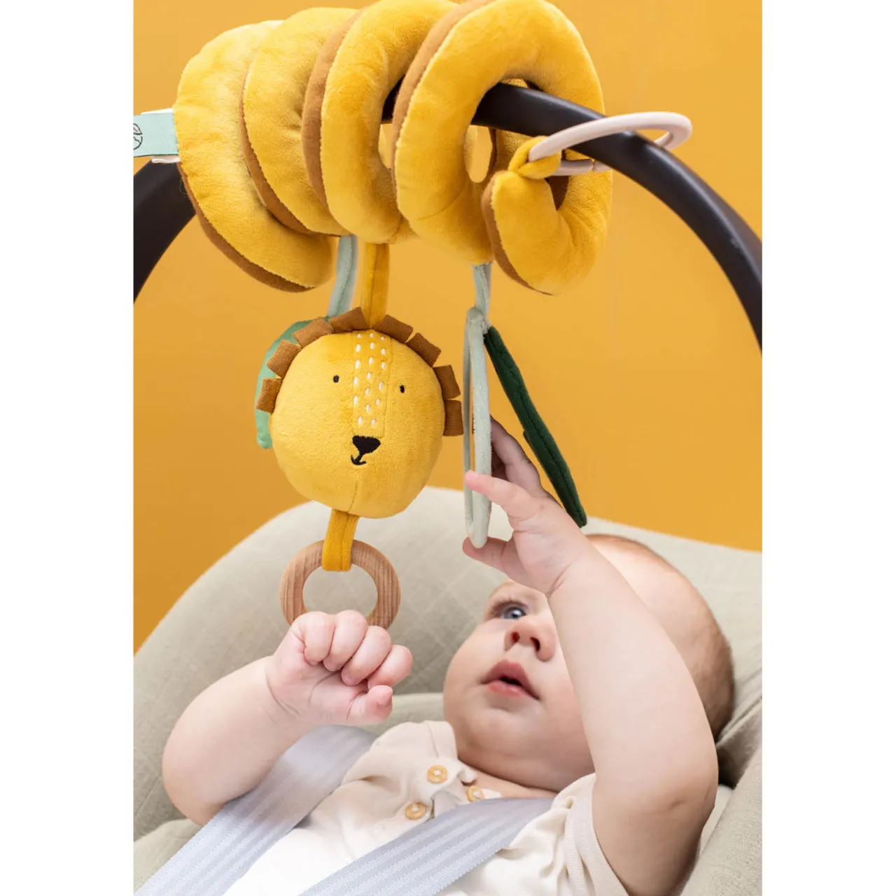 - Mr. Lion design, one activity spiral, three activity elements, wooden ring, mirror, curls around any baby carrier or playpen, elements can be taken off to continue play