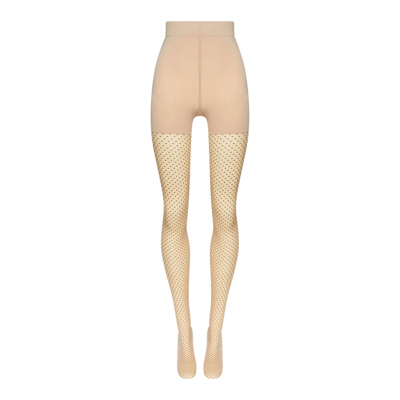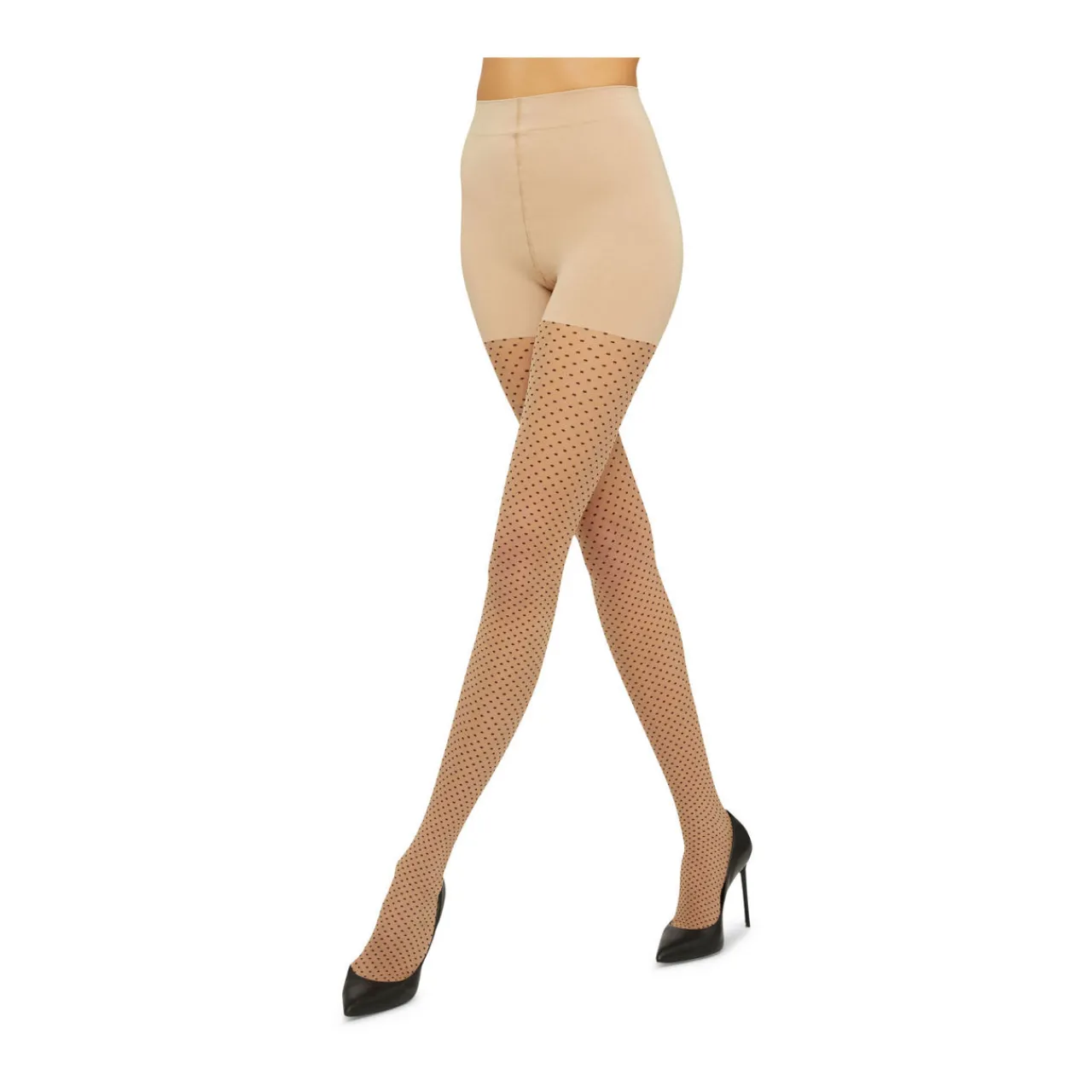 - 20 denier, matt style, circular knit design, medium forming opaque upper, sheer legs with geometric dot design, soft knitted-in wide waistband
